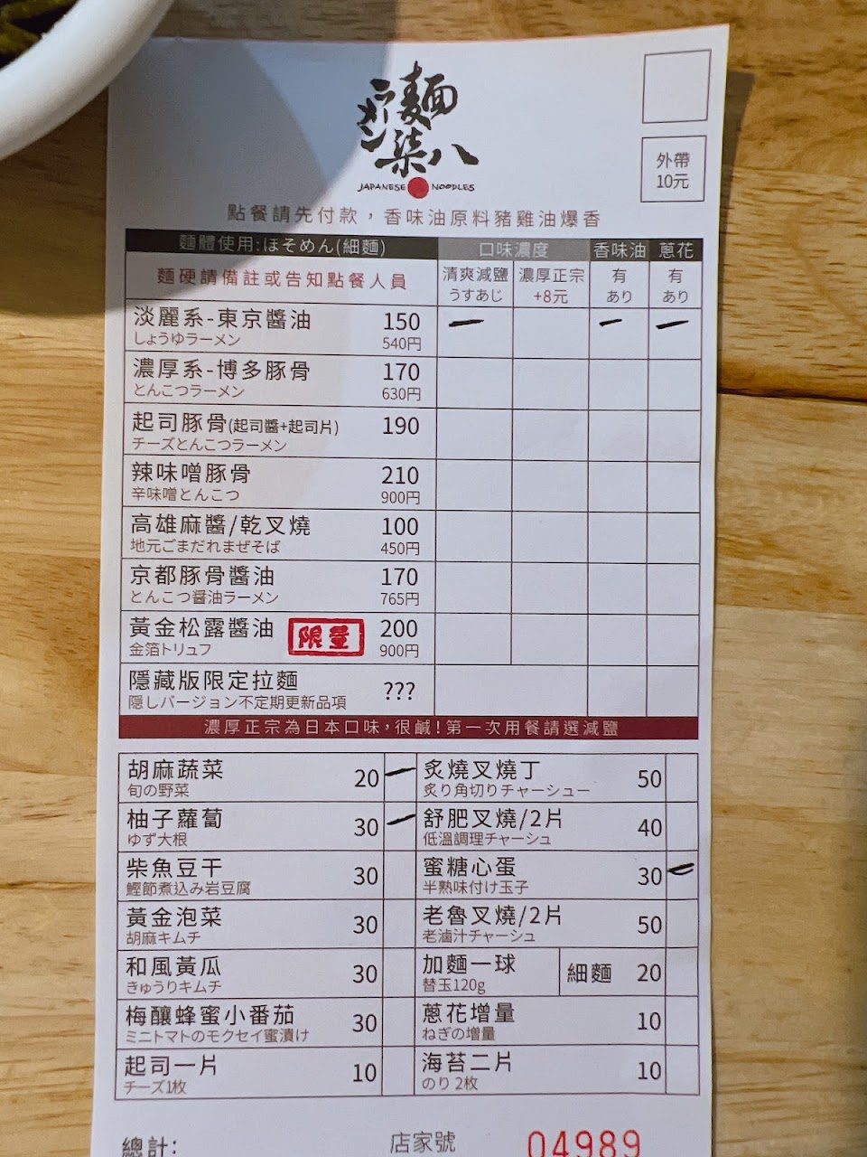 (⚠️請注意這家店只有禮拜五~ㄧ營業,每天的營業時間是不同的⚠️禮拜天:19:45~賣完、禮拜一:18:30~賣完,禮拜五、六:20:45~賣完。)禮拜天19:30左右到,因為還沒到開始營業時間被店員請進去坐下並發了號碼牌,坐定後每桌都被招待2盤小菜(炙燒叉燒丁、醋味海帶絲),老闆人也太好了吧?。清爽減鹽的湯頭喝起來好喝,裡面還有小香菇;一碗拉麵裡有2種肉片,拉麵本身就有附半顆溏心蛋了,不知情又加點了一顆(非常推),這家店用心的地方還有在佐料區放了超~~多種調味料(用鐵罐裝外面寫「辣」的那罐是真的很辣?)吃完約8:10,外面已經開始有排隊人潮了。