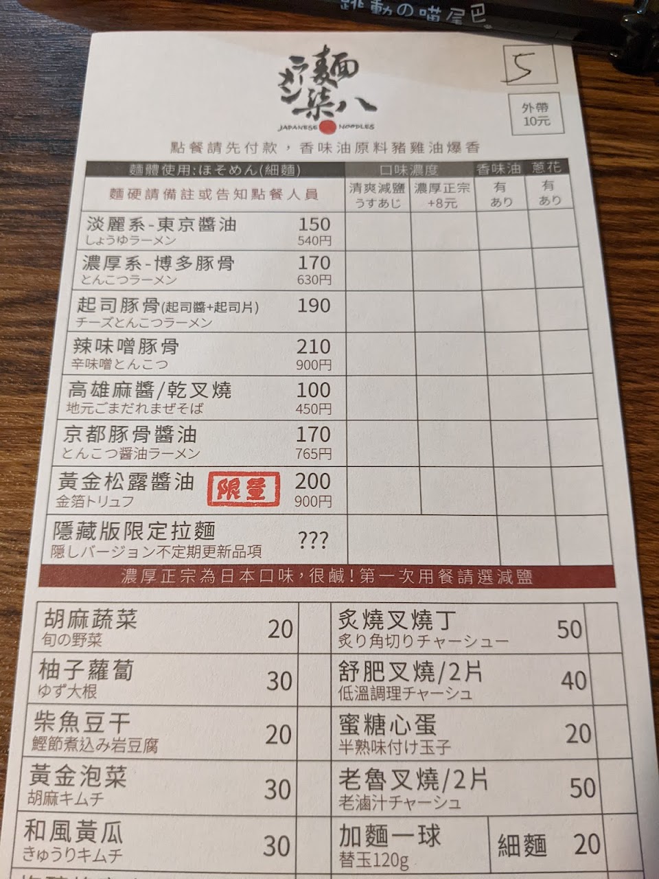 2024最新在地推薦餐廳的菜單_ラーメン麵柒八(不定期公休,請看Fb 粉絲頁)宵夜、拉麵的菜單、圖片