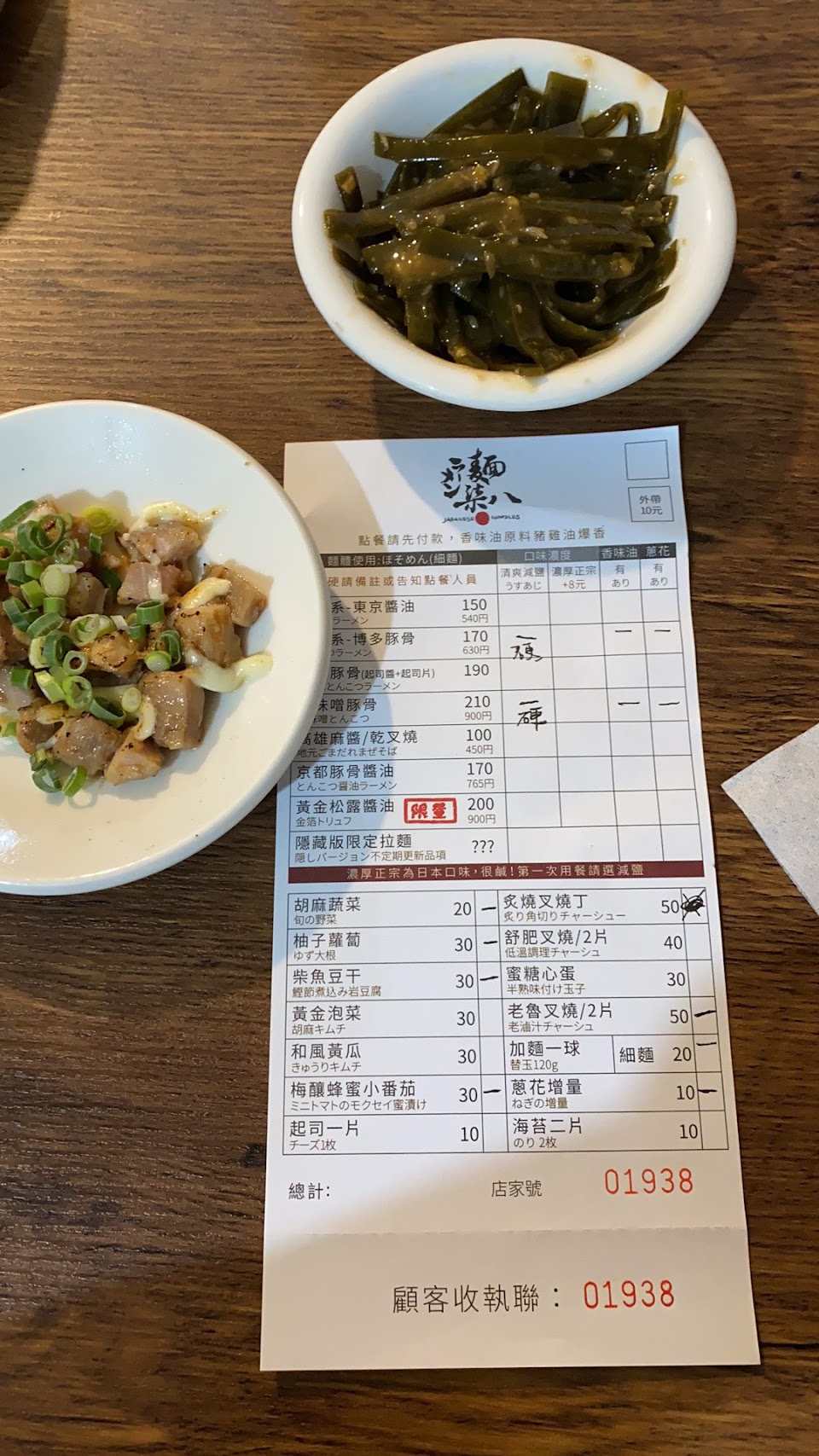 有送兩道小菜-昆布和焗烤雞肉丁 自己再加點了柴魚豆乾和柚香蘿蔔:柴魚豆乾超級無敵好吃!大推? 拉麵部分有特別告知口味偏鹹,所以建議點減鹽口味;淡麗拉麵的湯頭是有香菇味的雞湯,我個人大愛❤️裡面有叉燒肉和半顆溏心蛋,一碗150覺得CP值很高
