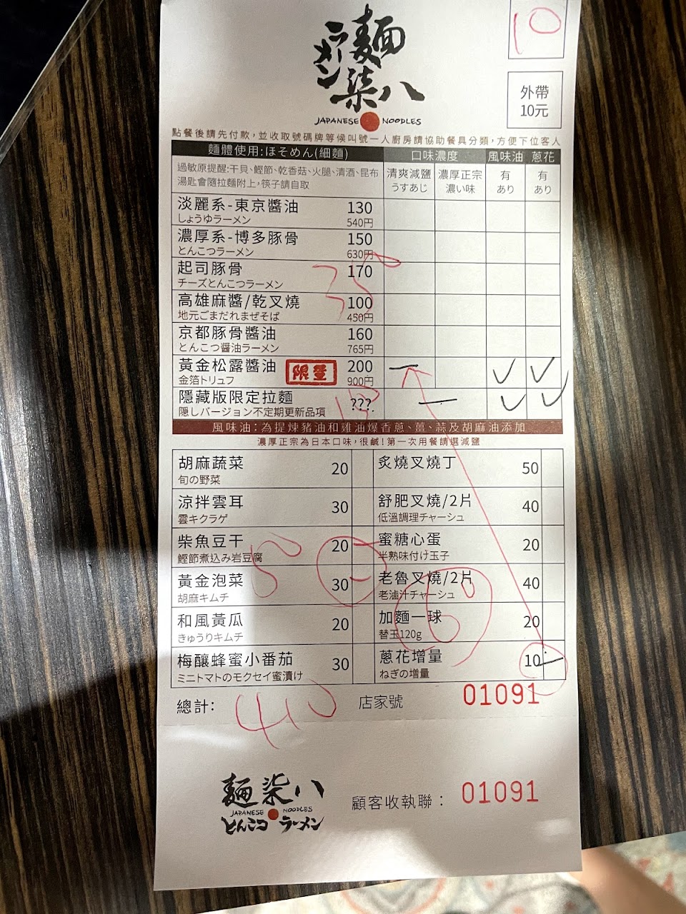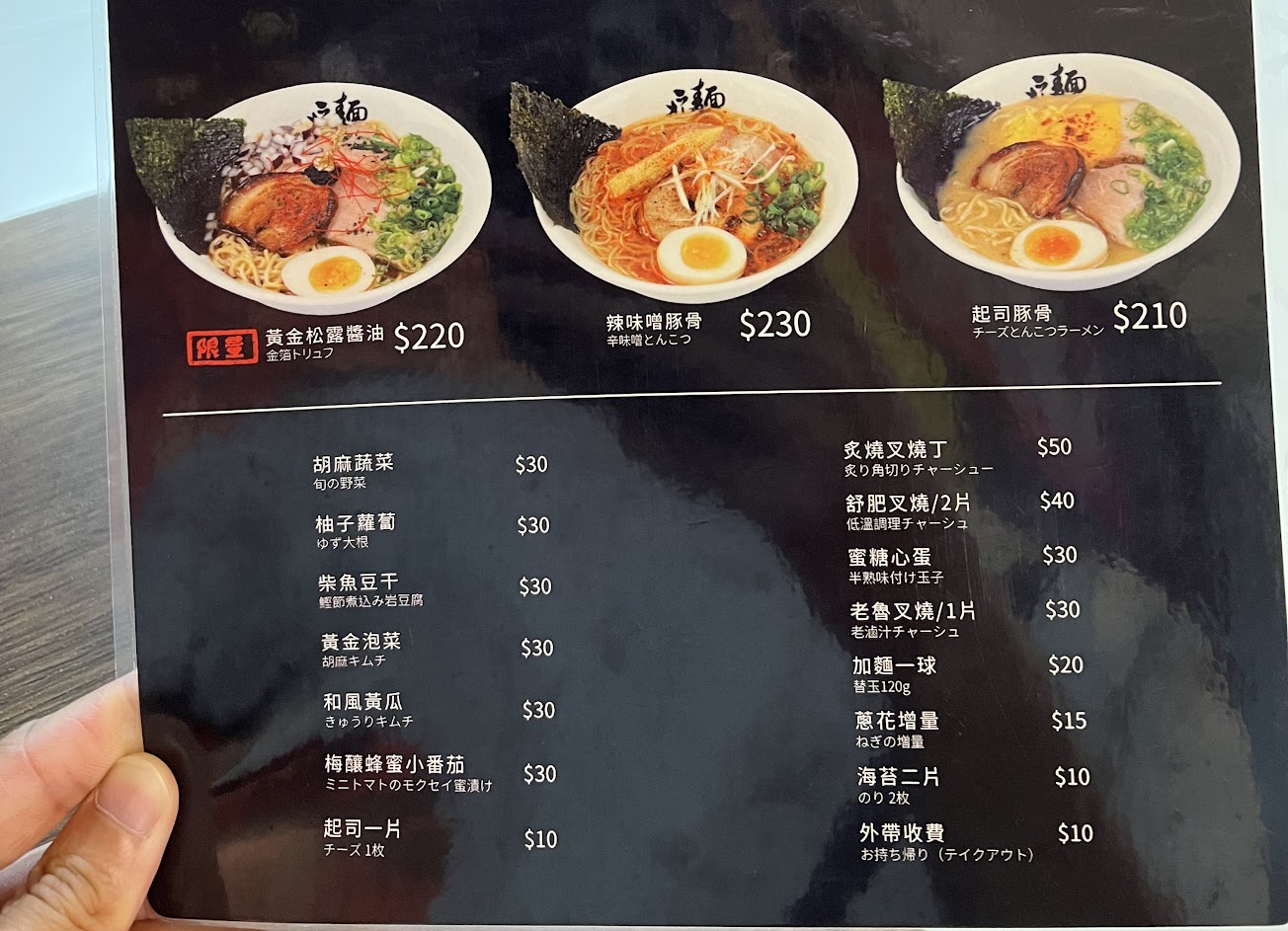 辣味增豚骨不會太辣,湯很濃郁,拉麵是細麵條,不會太軟,喜歡有口感的可以要求麵硬。黃金松露醬油拉麵是清湯,松露味很香好喝。黃金泡菜跟胡麻蔬菜都好吃。可惜梅釀蜂蜜小蕃茄售完沒吃到。因為是小攤子沒有冷氣,但有電風扇跟冰檸檬水。
