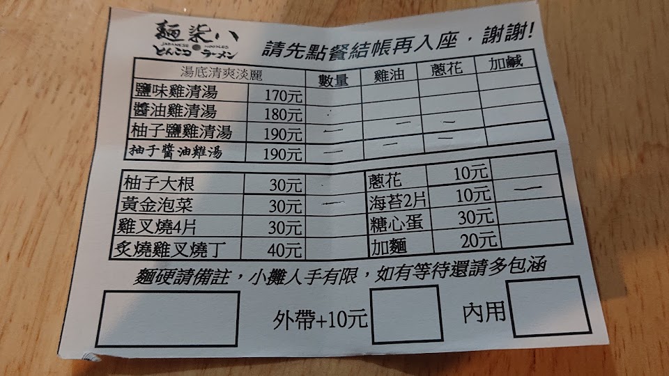 (⚠️請注意這家店只有禮拜五~ㄧ營業,每天的營業時間是不同的⚠️禮拜天:19:45~賣完、禮拜一:18:30~賣完,禮拜五、六:20:45~賣完。)禮拜天19:30左右到,因為還沒到開始營業時間被店員請進去坐下並發了號碼牌,坐定後每桌都被招待2盤小菜(炙燒叉燒丁、醋味海帶絲),老闆人也太好了吧?。清爽減鹽的湯頭喝起來好喝,裡面還有小香菇;一碗拉麵裡有2種肉片,拉麵本身就有附半顆溏心蛋了,不知情又加點了一顆(非常推),這家店用心的地方還有在佐料區放了超~~多種調味料(用鐵罐裝外面寫「辣」的那罐是真的很辣?)吃完約8:10,外面已經開始有排隊人潮了。 (公告寫因為老闆身體因素,預計2024/7/8結束營業,請大家把握機會去品嚐看看吧) 服務 內用 餐點類型 晚餐 平均每人消費金額 $1-200 建議的餐點 招待炙燒雞叉燒丁