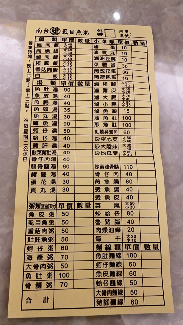 早場是10:30~21:30 有米糕,燉湯有豬腦、香菇雞腳。 晚場23:00~07:30 有現煮的魚湯魚粥或豬肝湯之類的。 都很好吃。