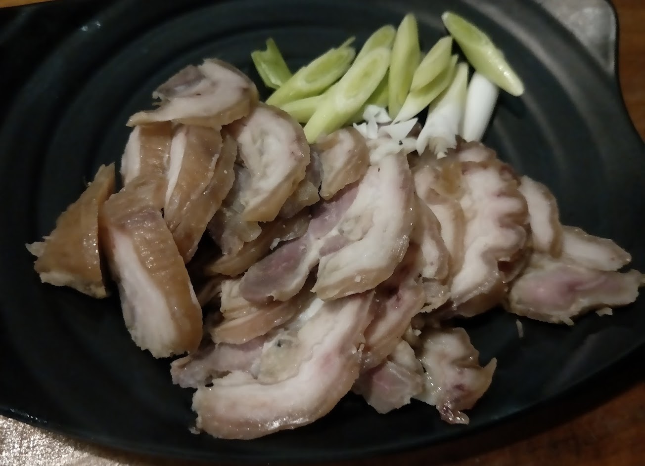 由於桶仔雞要70分鐘,所以放棄點雞湯鍋-蒜頭蛤蠣雞湯鍋,這是最後才上的菜,一端上來竟然這麼一大鍋有點嚇到,從照片可看到蒜頭是非常完整完全沒有拍過,我們夾來吃…嗯!還是硬的非爛透,湯頭雖有蒜香但是雞肉內吃不出來,可惜了它們用那麼好口感的雞肉了!很喜歡它的雞皮肥美不油膩略帶調整味道的鹹,應該是蛤蠣的自然鹹味,如果燉久讓蒜頭都爛化掉是會非常出色的一鍋湯,對了!蛤蠣還滿大顆的。 烤鯖魚烤得不錯,魚肉柔軟又鮮甜是四道菜表現最好的。 酒香蹄膀(冷盤)吃起來有淡淡酒香不油膩,但是單吃即使配大蔥仍覺得鹹,只能跟白飯一起吃,頗可惜的一道菜。 蠔油洋蔥炒松阪豬比前一道更鹹了!雖然是為了下飯而點但是配飯吃仍過鹹,只能單吃松阪豬並在吃之前在盤子抹兩下去除上面的醬汁,吃起來才恰當。 最後,我們把那未吃到八成的一大鍋湯打包回家,打算回家自行好好燉煮,也另外買了蒜頭打算拍碎加入。