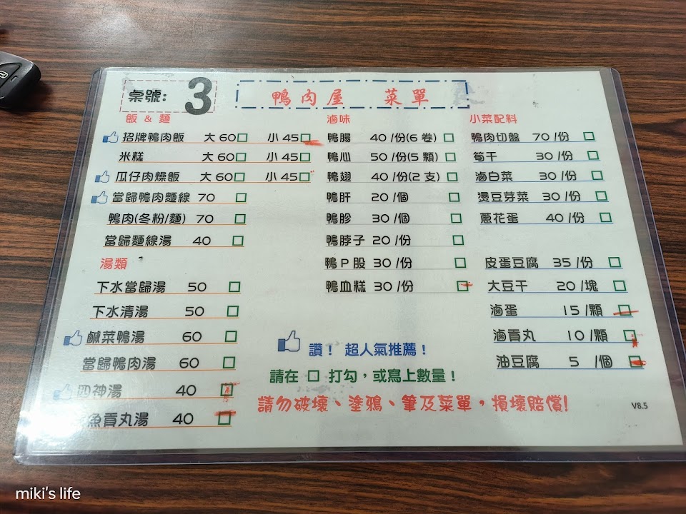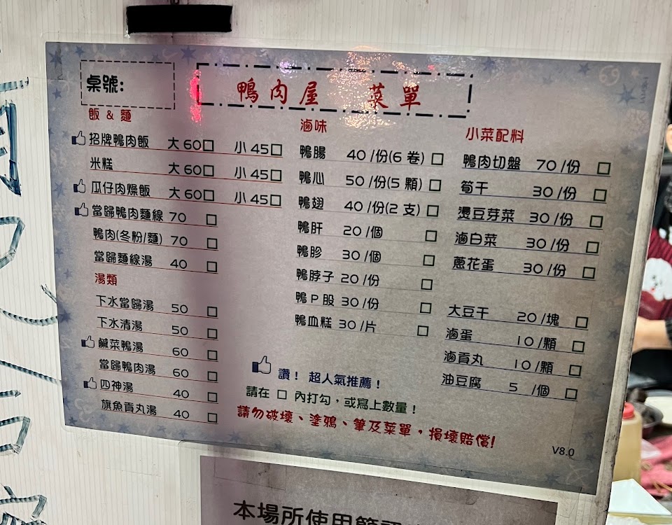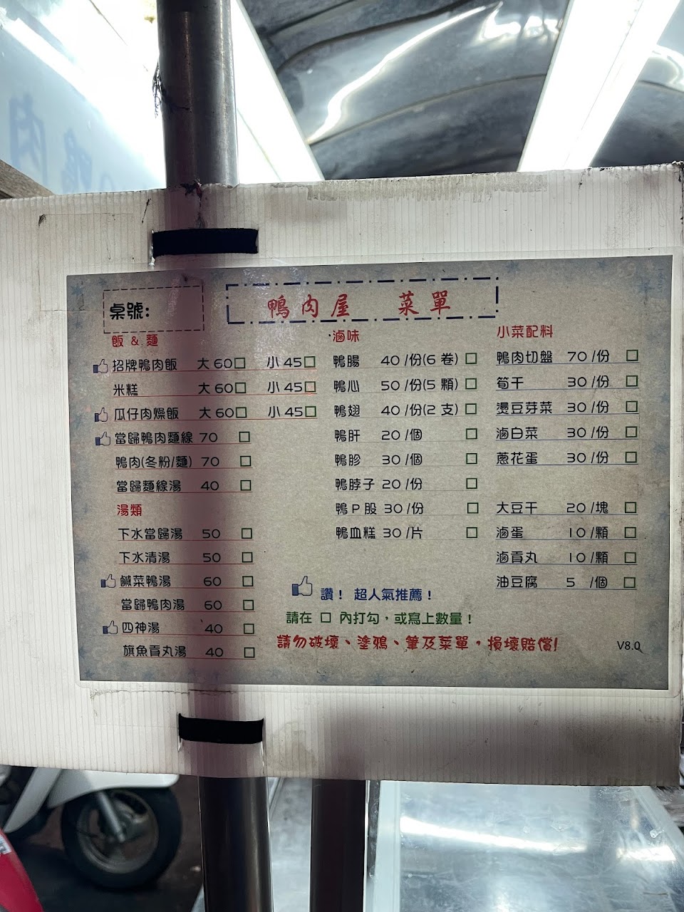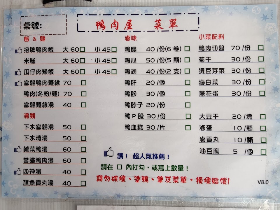 有幾次內用的經驗,鴨肉飯跟當歸系列還不錯,油豆腐也還可以,有滷到入味,鴨腸不錯。唯獨店內用餐空間比較小,上次去還遇到有客人在喝酒,老闆娘有陪他們聊天(坐陪),很大聲有點吵。有一次快打烊去吃,菜單上被多劃了兩樣不是我點的菜(印象中剛剛點菜單是空白的,不然就是沒擦乾淨的菜單),第一次吃到店內的蔥花蛋,有點冷,不是現炒的那種,不過我還是有乖乖結帳。