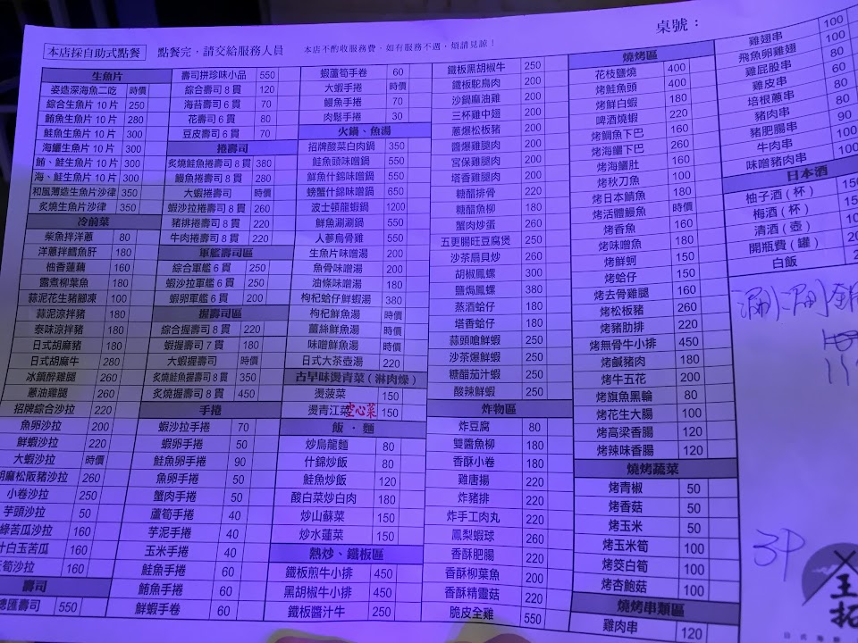 炒水蓮, 綜合生魚片, 綜合壽司, 什錦炒飯, 綜合沙拉 芋頭好吃, 炒烏龍麵, 鳳梨蝦球, 炸豬排, 烤豬肋排, 五更腸旺, 唐揚雞, 炸豆腐, 下巴烤, 蔥爆牛五花, 炒山蘇, 蚵仔酥, 炒蛤蜊