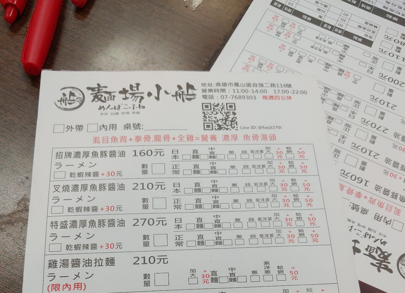 優點:150就有半顆蛋有肉CP值蠻高的平價拉麵,最推的是湯頭,很濃郁,叉燒不硬還不錯,很喜歡他們家的辣椒,滿香的純辣感沒有不是那種豆瓣醬的辣,店內有水可以自己倒 缺點:畢竟是在五甲自強夜市,外面確實稍微比較難停車一點,比較早來(五點多)吃完後出去摩托車完全被其他車堵死了? 一進去聞到很明顯的神明桌拜拜“香”的味道,回家時還想說奇怪身上怎麼菸的味道有點重原來是被整個“香薰”過了…這點是內用最不喜歡的地方 還有外面的店狗柴柴很可愛,但是最好還是牽繩比較好,雖然狗狗很乖但是還是有可能被外面的車子或什麼吸引衝撞出去,輕則狗狗跑丟,嚴重點會引發車禍甚至狗狗受傷,牽繩真的是保護他也保護其他人? 服務 內用 餐點類型 晚餐 平均每人消費金額 $1-200 餐點:5 服務:4 氣氛:4 建議的餐點 招牌濃厚魚豚醬油拉麵