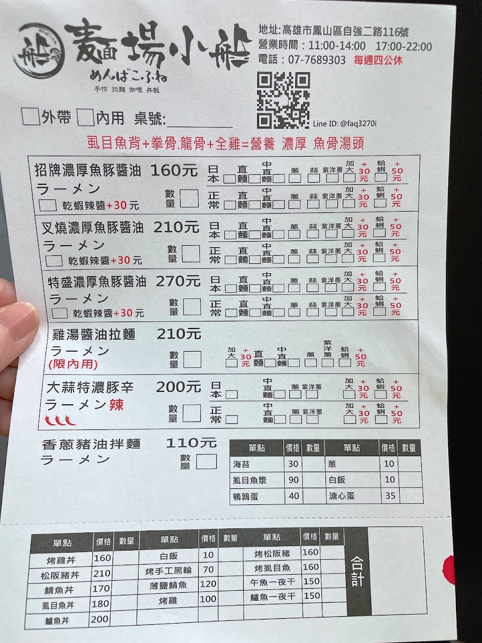 點了招牌濃厚魚醬油拉麵160元跟限內用的雞湯醬油拉麵210元