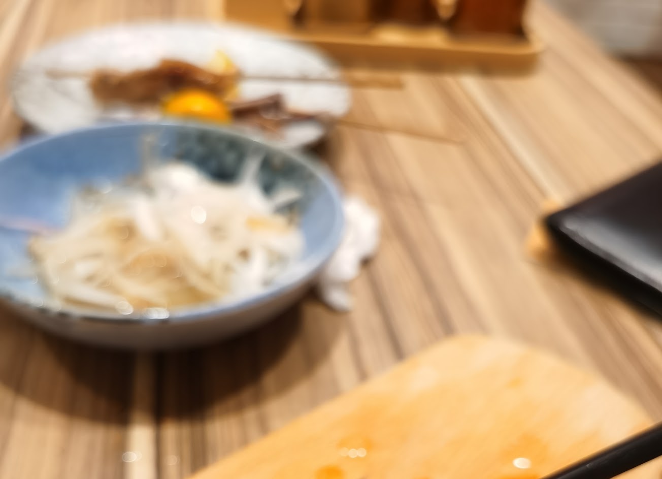 整體而言中規中矩 鹽燒牛肋串(98元/兩小串): 我理想中的牛肋條外層會是外面焦脆,有一層深褐色的梅納式反應的外殼,裡面是鮮嫩多汁。這次吃起來多汁有達到,但外層的處理不到位,不知是水分沒擦乾還是溫度太低 嚴燒雞翅(78元/兩隻): 雞翅是用兩節翅再多含不完整的小棒腿,表皮烤的很脆,肉很嫩,肉汁也多,調味略顯單調,喜歡單吃原味的人可以試試看 鹽燒雞肉(88元/兩串) 用的是雞腿的部分,皮脆肉嫩,與雞翅一樣調味也是略顯單調,喜歡原味的再嘗試。 干貝蛤蜊茶碗蒸(68元/1份) 吃得出茶碗蒸的湯底的海鮮鮮味,但裡面料的部分只有放一顆蛤蜊,跟”乾貨”的干貝,口感較差,還有一小塊肉。 日式豚五花(158元/1份) 整份外皮酥脆,油香四溢,喜歡脆皮五花的人可以試試看,五花下面鋪了一層生洋蔥,還附帶生的蒜片,與芥末籽醬,可以變換口味,不過如果附上的是炸過的蒜片我會更喜歡。 烏龍麵(158/一份) 與豬肉片、高麗菜共同炒製的烏龍麵,上面先蓋一層半熟的蛋包,淋上美乃滋,最上面再撒上柴魚片,視覺豐盛,份量稍小,味道不差,但不到令人驚豔。 烤的東西旁邊有附紅色的嫩薑,吃起來跟壽司店差不多,只是口感再濕潤一些 有一桶自助的柴魚湯 啤酒(120元): orion生啤,啤酒杯有先冰鎮處理,所以可以一直保持啤酒的鮮度。 梅酒: 老松天空之月加兩顆冰塊
