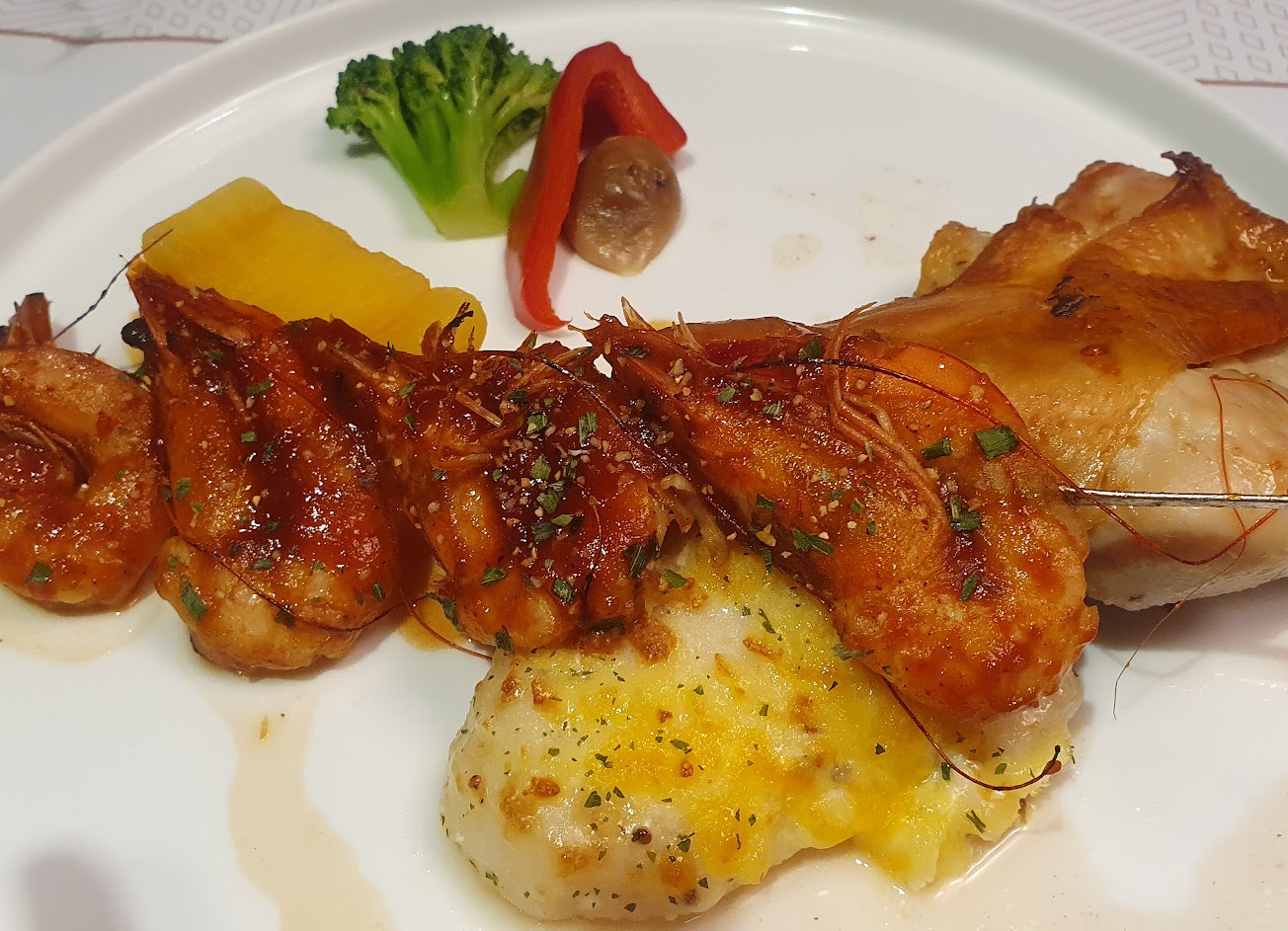開胃品 優格鮮蝦時蔬, 生日招待的蛋糕, 義式丁骨豬排