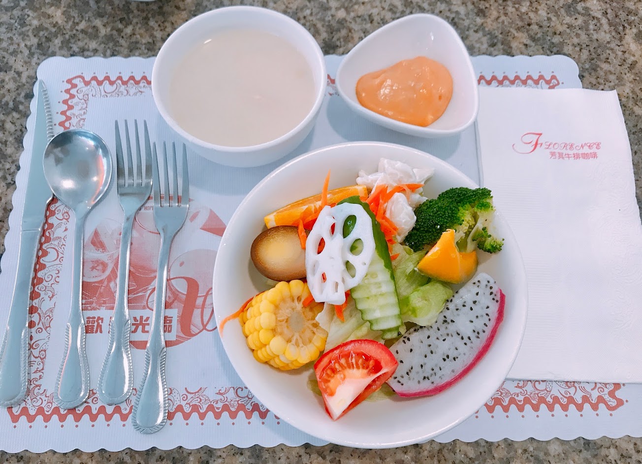 沙拉比我想到的大碗,各式的水果擺盤,甚至加了紫番薯蠻特殊的,份量若以7-11沙拉水準,打約在75-80元左右。
