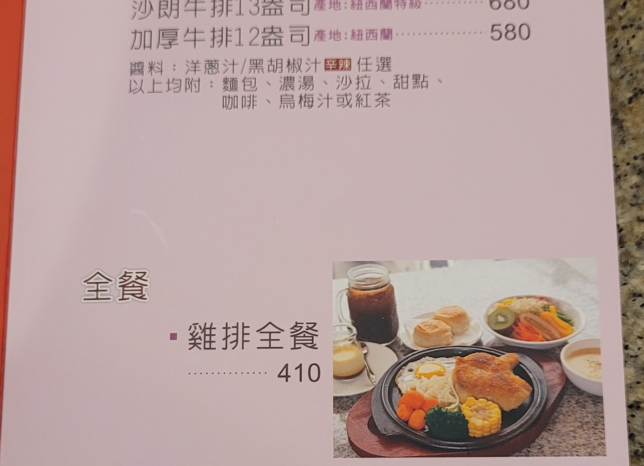 價錢公道,不會太貴,而且食物非常好吃,分量很足,當天點了一份雞排(包含濃湯.麵包2顆.紅茶) 一份綜合全餐 牛豬蝦小卷(包含濃湯,麵包2顆.沙拉.甜點3選1,還有紅茶 烏梅汁 咖啡3選1)雞排煎得剛剛好不會太老太柴,綜合餐的肉也是軟嫩多汁,超好吃的 沙拉的份量也是一整碗冰涼爽口,我們選紅茶跟烏梅汁,古早味的紅茶喝完回甘,烏梅汁則是酸甜剛好會讓人一口接著一口喝完,甜點選了奶酪上面有一層酸甜芒果醬配上甜甜的奶酪讓人吃完還想再來一份.非常推薦