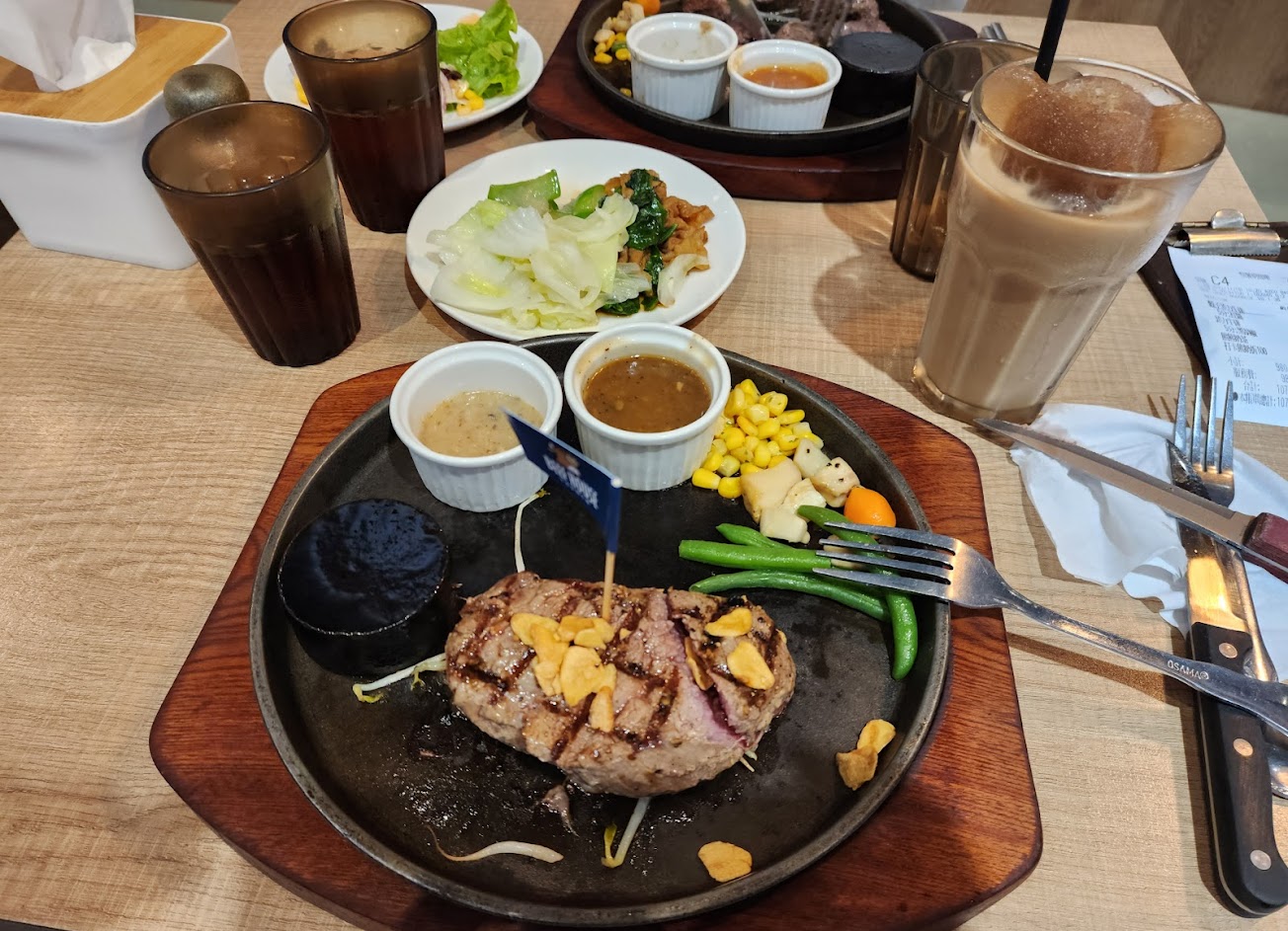 點主餐加自助吧吃到飽,自助吧的組合很特別,除了基本的沙拉濃湯之外,還有披薩、炸的餃子?湯包、炸薯條。 炸物類的還蠻配排餐的,但是另一邊還有台式炒麵(怎不是義大利麵?)、台式炒菜、肉燥飯、蒸餃類的?, 然後美式牛排店的裝潢搭配韓國流行女團的歌更詭異? 餐點:4 服務:4 氣氛:4