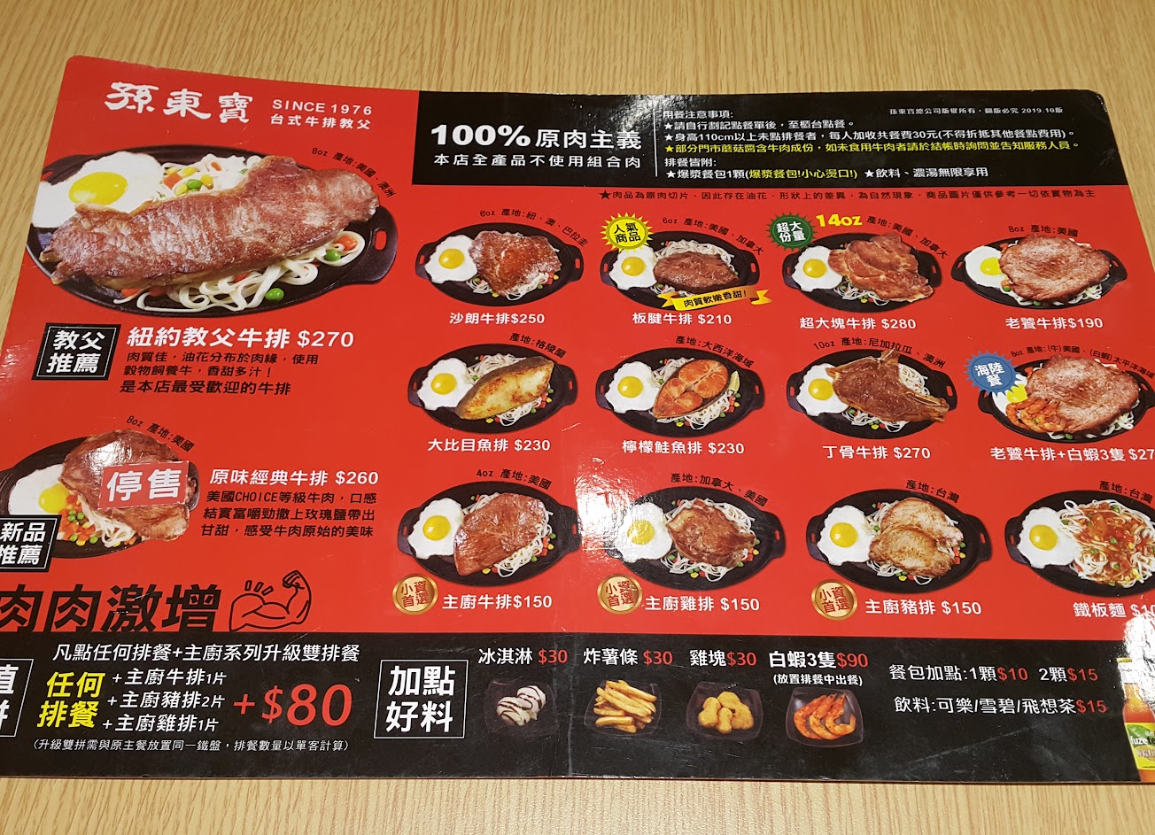 孫東寶牛排館比一般牛排店的環境,來的乾淨明亮,用餐環境舒適,排餐選擇多樣性,可額外加價其他點心類,也可+80元升級為雙拼(搭配其他肉品)