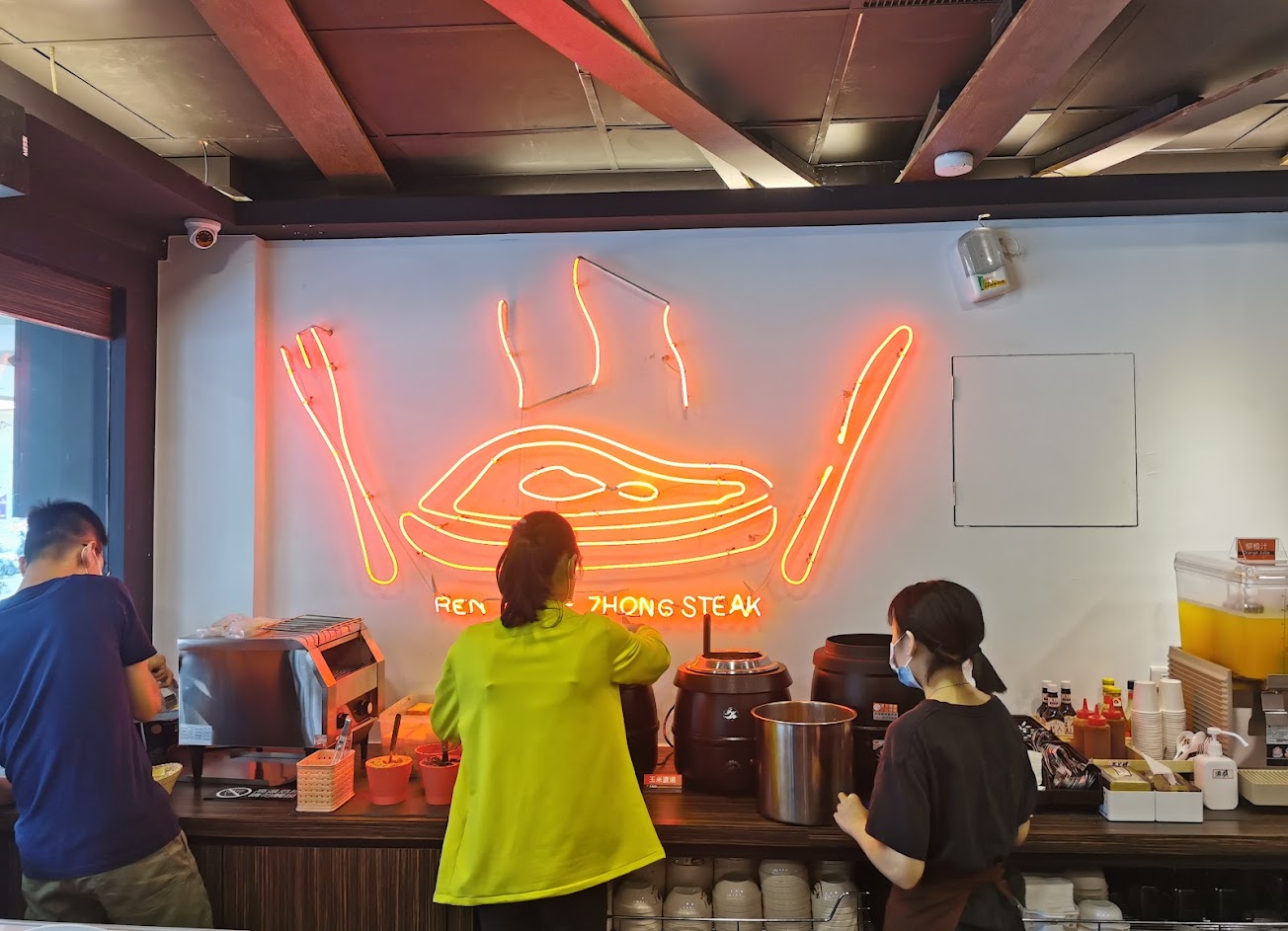這樣平易近人的價位、物超所值的肉品,還有冷冷的天就想來一碗羅宋湯或玉米濃湯配麵包丁真的很棒,烤土司的部分有香蒜吐司與一般吐司做選擇,飲料比較一般,但有無糖綠茶可以解油膩,牛排真的建議一上來就要馬上享用,才不會錯過美味時機,服務生很熱情,很愉快的用餐XD 服務 內用