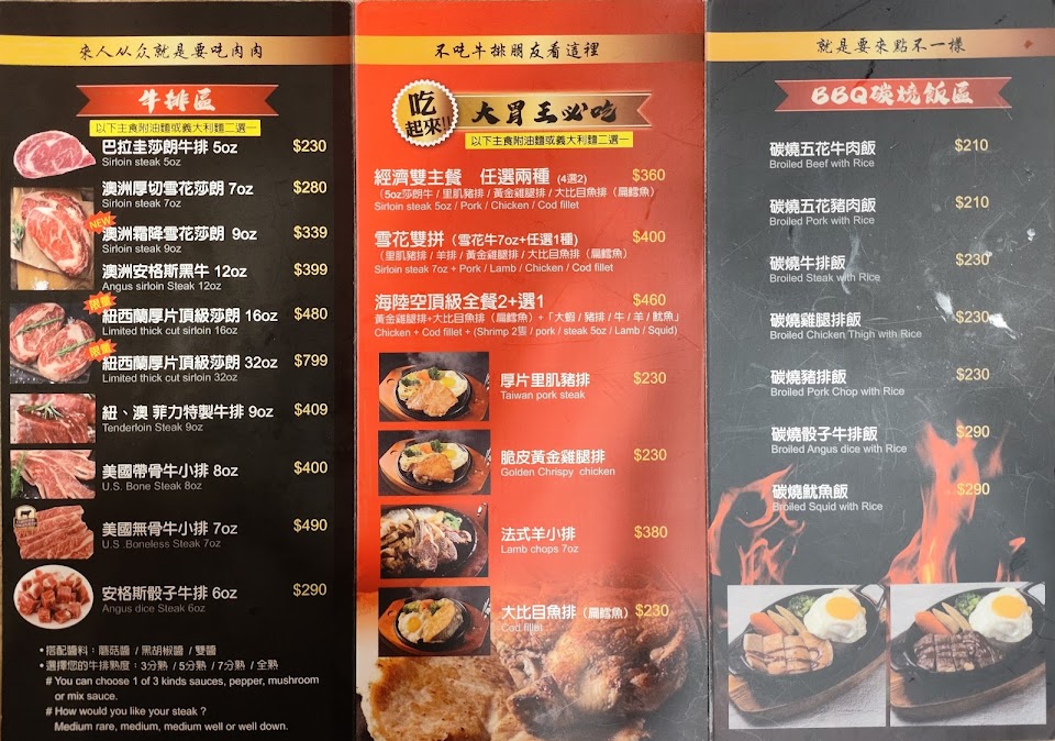 還可以接受,親子來是蠻不錯的。 服務 內用 餐點類型 晚餐 平均每人消費金額 $200-400 餐點:5 服務:5 氣氛:4 建議的餐點 紐西蘭厚片頂級沙朗16oz