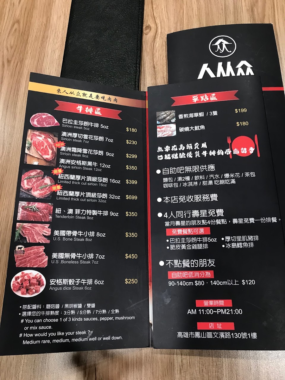 平價好吃有街口 服務 內用 餐點類型 晚餐 平均每人消費金額 $200-400 餐點:5 服務:5 氣氛:5 建議的餐點 安格斯塞子牛排, 紐西蘭厚片頂級沙朗16oz