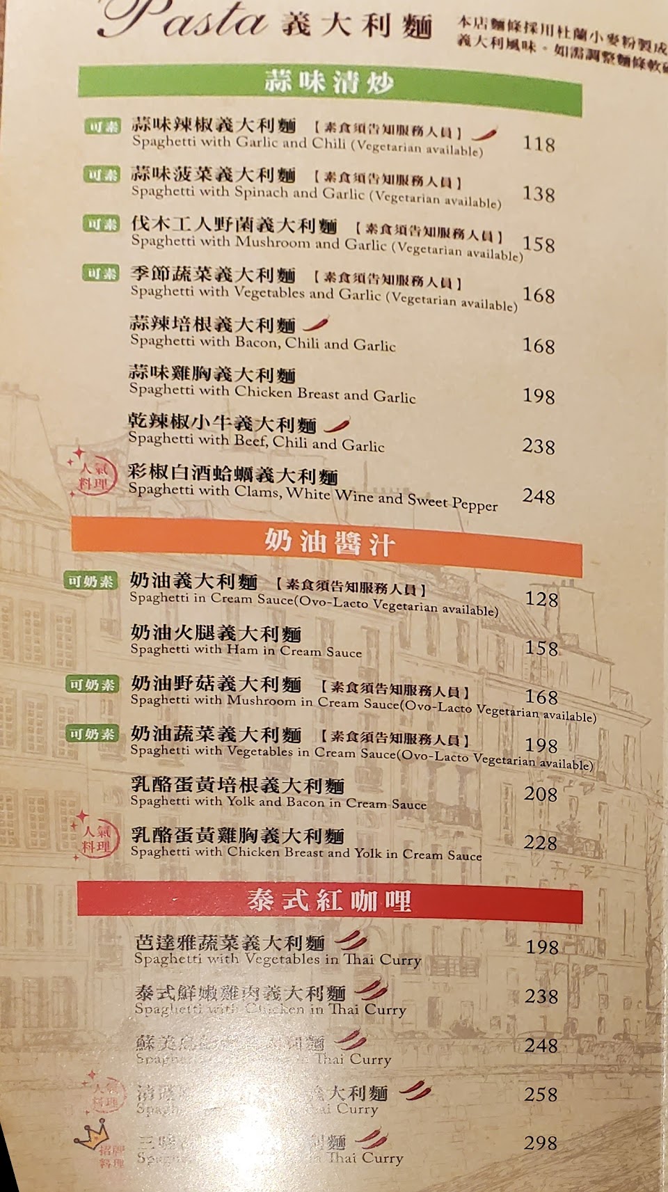 兒童餐一點都不適合兒童?麵太硬,解釋說是義大利麵體的關係(我吃過更更多間義大利麵怎麼就沒這問題呢,而且給孩子吃的也煮軟一點吧)飛機餐盤上還有沒洗乾淨的痕跡,香蘋奶茶像在喝ikea香香包(本來以爲很特別還點了兩杯,結果傻爆眼),泰式義大利麵的炸雞油耗味非常重,椰香也不夠,重點是非常單調,235巷還比較好吃欸?花錢買教訓,一顆星給店員,會一直問餐點滿不滿意,雖忙碌也都面帶笑容,但集團如果只會訓練店員詢問滿意度,而不去改善餐點,那真的只能在大賣場吸引路過的客人了~