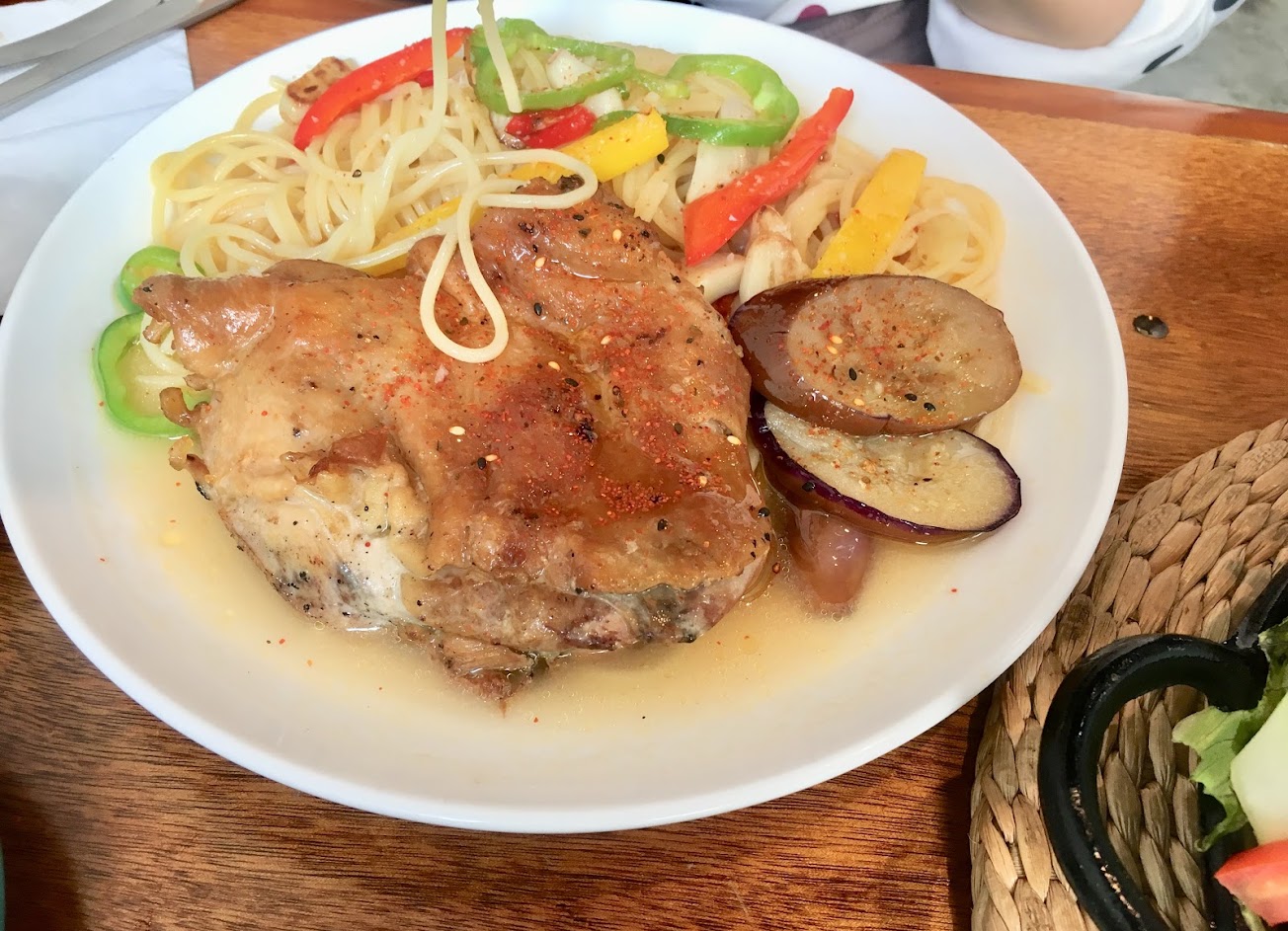 在小巷中,對面就是公園,連機車都很不好停,但也因為這樣多了份寧靜閑散。 推薦水果茶,用鳳梨醬與水果丁做成的水果茶,令人驚艷,滿滿水果味混合茶香,重點是不會太甜膩。 有可愛的庭院座位,進到室內空間冷氣襲來,加上老屋的裝設,雖是酷熱的天氣仍感受到舒爽。 沒有紙本菜單,菜餚全寫在櫃檯黑板上,在考慮點哪道菜的同時,旁邊店員還幫忙提供辣度等意見,雖然點了兩道說會辣的義大利麵,但平常少吃辣的我們也覺得可以接受。 室內空間主要分兩區,往裡面走有更大的桌子可以供約6-8人使用。再後面還有一個小後院, 餐點味道很好,食材新鮮,真才實料,又有點特別,要自己吃過才知道。套餐除了含有一杯飲料,另有一份好吃的木耳甜湯。 餐點份量很大,兩個人點兩個義大利麵套餐跟一個熱沙拉有點太飽。