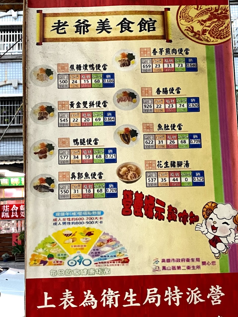 老爺美食館是有衛生局認證的健康飲食小吃示範店,牆⬆️有註明便當有營養師鑑定的營養資訊,鴨腿便當只有577卡。該店位於大明路附近、交通方面開車真的很不方便停車、找車位會找到懷疑人生、建議騎車來吃。招牌燻鴨、表皮燻上一層薄薄一出焦糖色即便是看起來很柴的部位,也又嫩又多汁,所以每一塊都很嫩很香,能吃到鴨肉原始的甜味,真的不簡單!但是來第三次時、鴨肉表皮帶點苦味、應該是燻過頭、糖變苦味,鴨腿是很嫩,但我建議鴨胸才是最美味嫩帶Q帶香氣,鴨肉飯也是必點加它的香辣菜脯(不辣)更是美味、它香茅煎肉口感很像三層肉介於臘肉中間.帶ㄧ點點香茅.個人還是喜歡鴨肉、其他湯品、菜色.都在水準之上、雖然是平民小吃、有用心。(更新)店門口可以停一台車