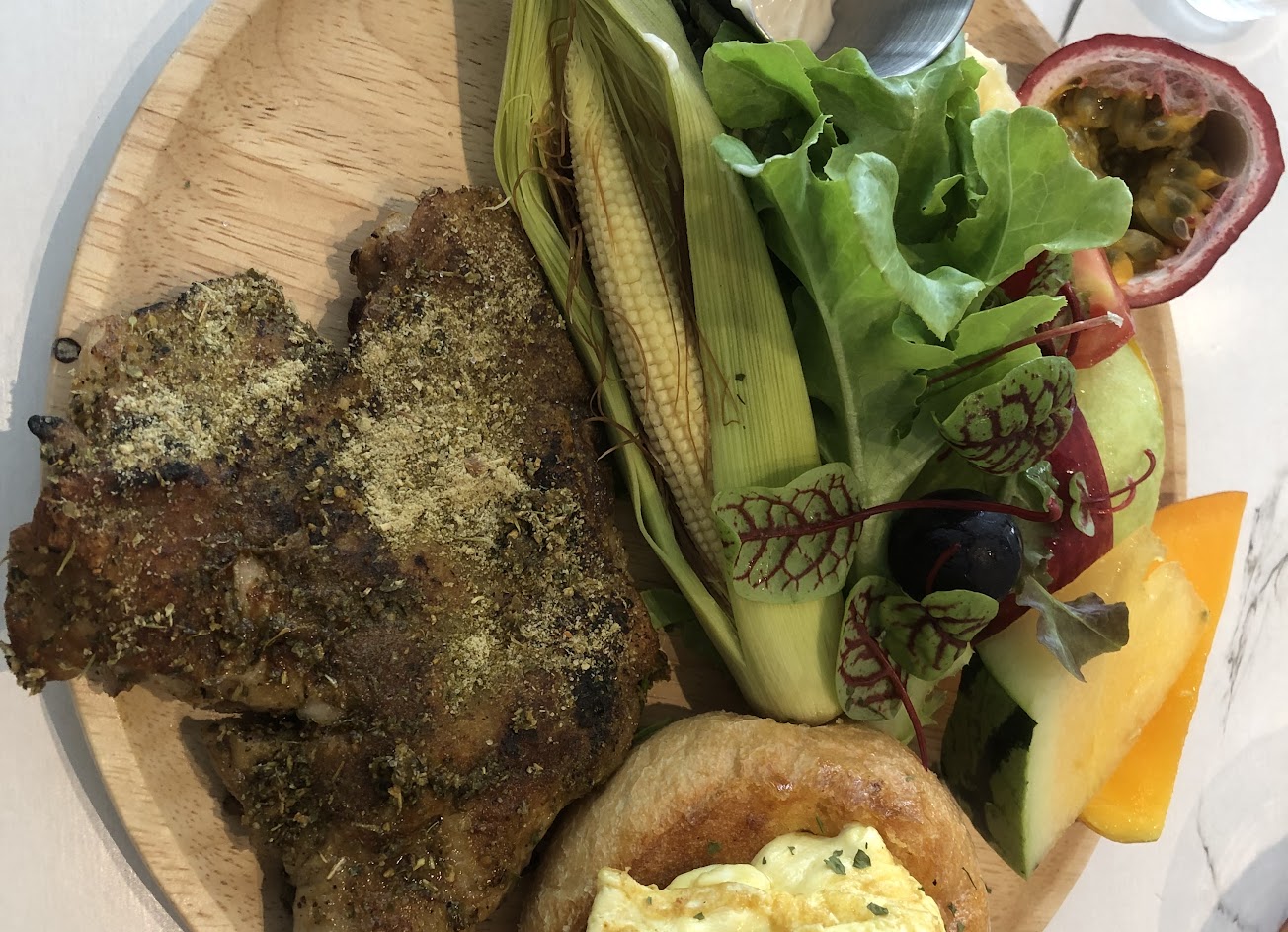 雞腿排很嫩,還有有豐富的水果,麵包沾芒果醬也超好吃! 餐點:4 服務:5 氣氛:4