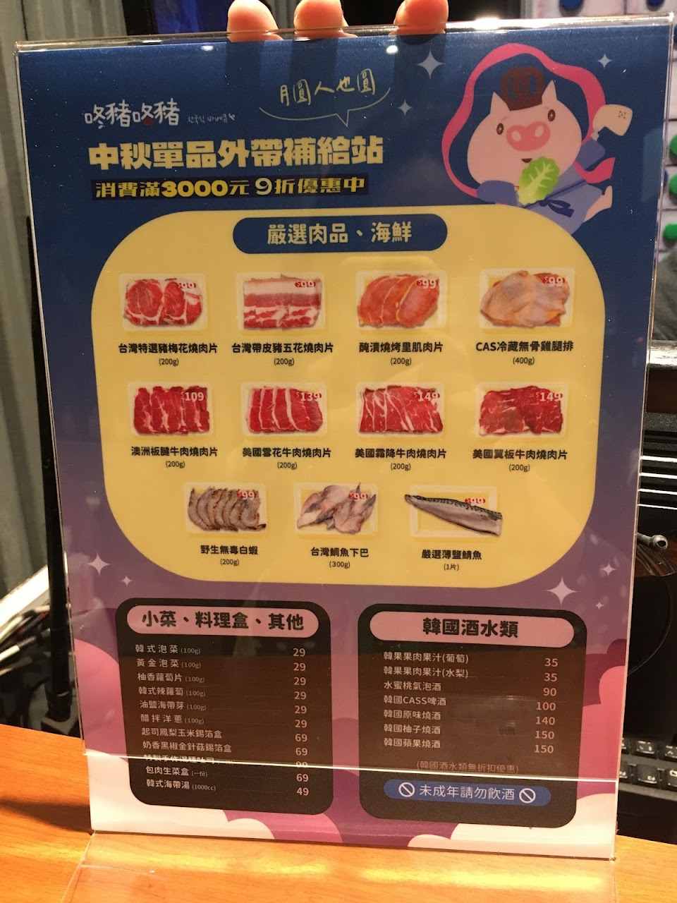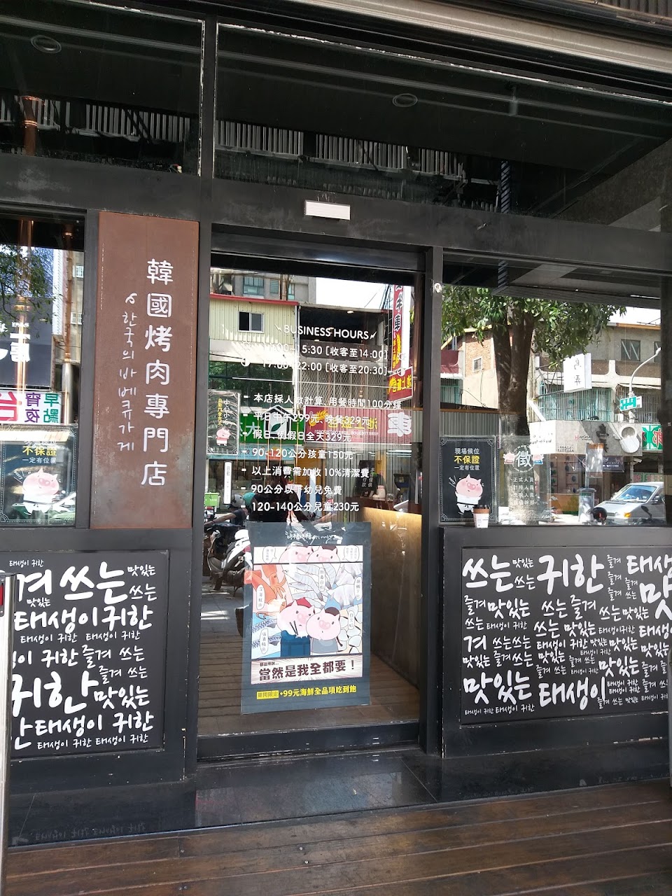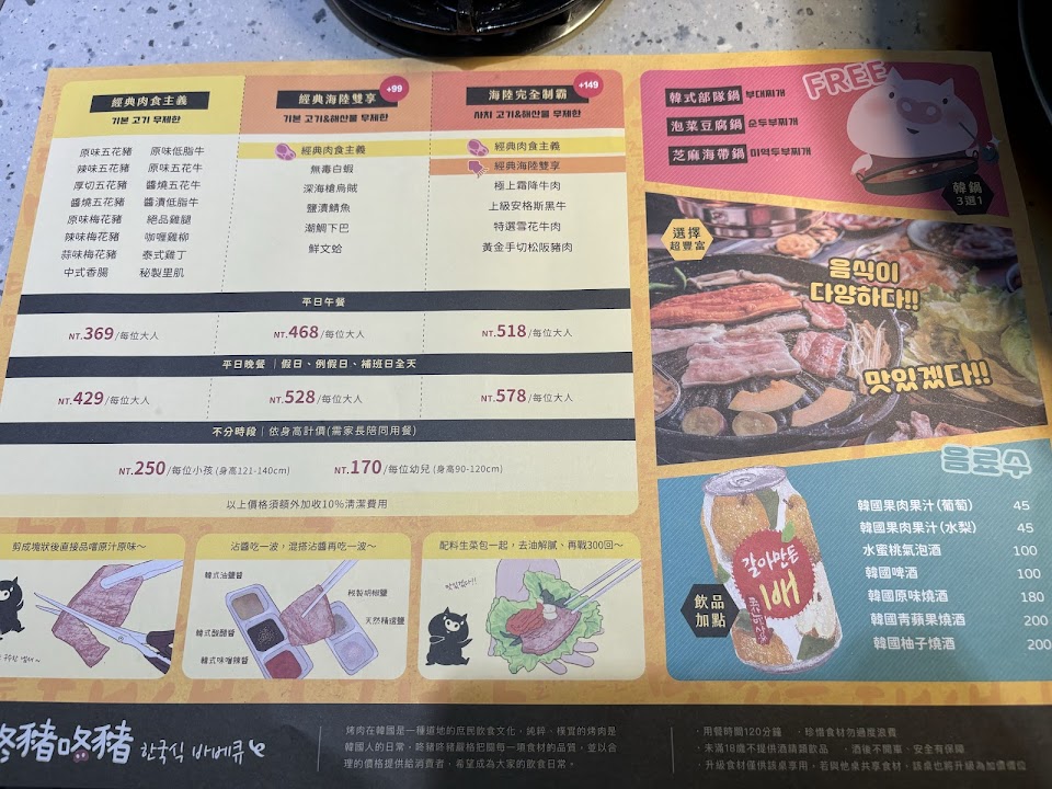 忘記拍價目表了 平日跟假日不一樣 東西超級多樣化 裝潢也很酷 肉就普普但有提供原味的可以自己調味道很讚五花肉太油了烤在乾還是沒什麼用韓式炸雞跟炸雞翅很好吃 生菜不苦優秀 部隊鍋的湯唯酸還不錯喝但看起來有點噁是真的? 咖啡凍會苦很棒咖啡凍加蜂蜜跟鮮奶油蠻好吃的 巧克力冰淇淋很甜有點像阿華田口味 奶茶兩個都不錯喝 剛進去的時候只有看到一個服務生在忙東忙西還不會態度很差真的是屌麻煩公司多排一點人 …