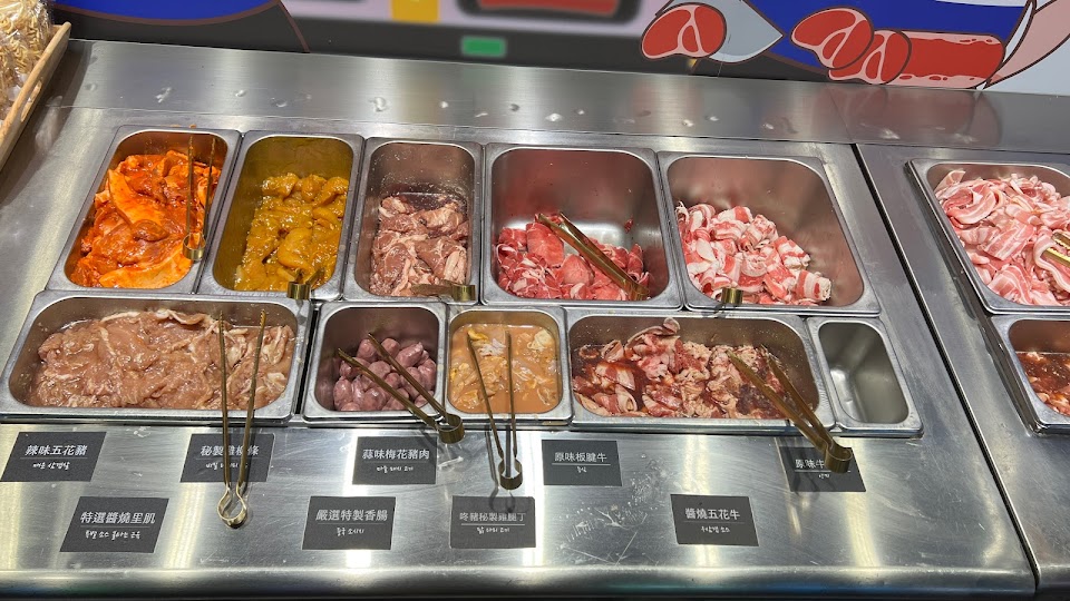 肉品多,小菜和熟食很好吃。。還有甜點和冰淇淋。。東西沒了,服務人員很快就會補上。烤盤紙髒,服務人員更換速度也很迅速。此價位CP值滿高的,是個聚餐吃肉的好場所