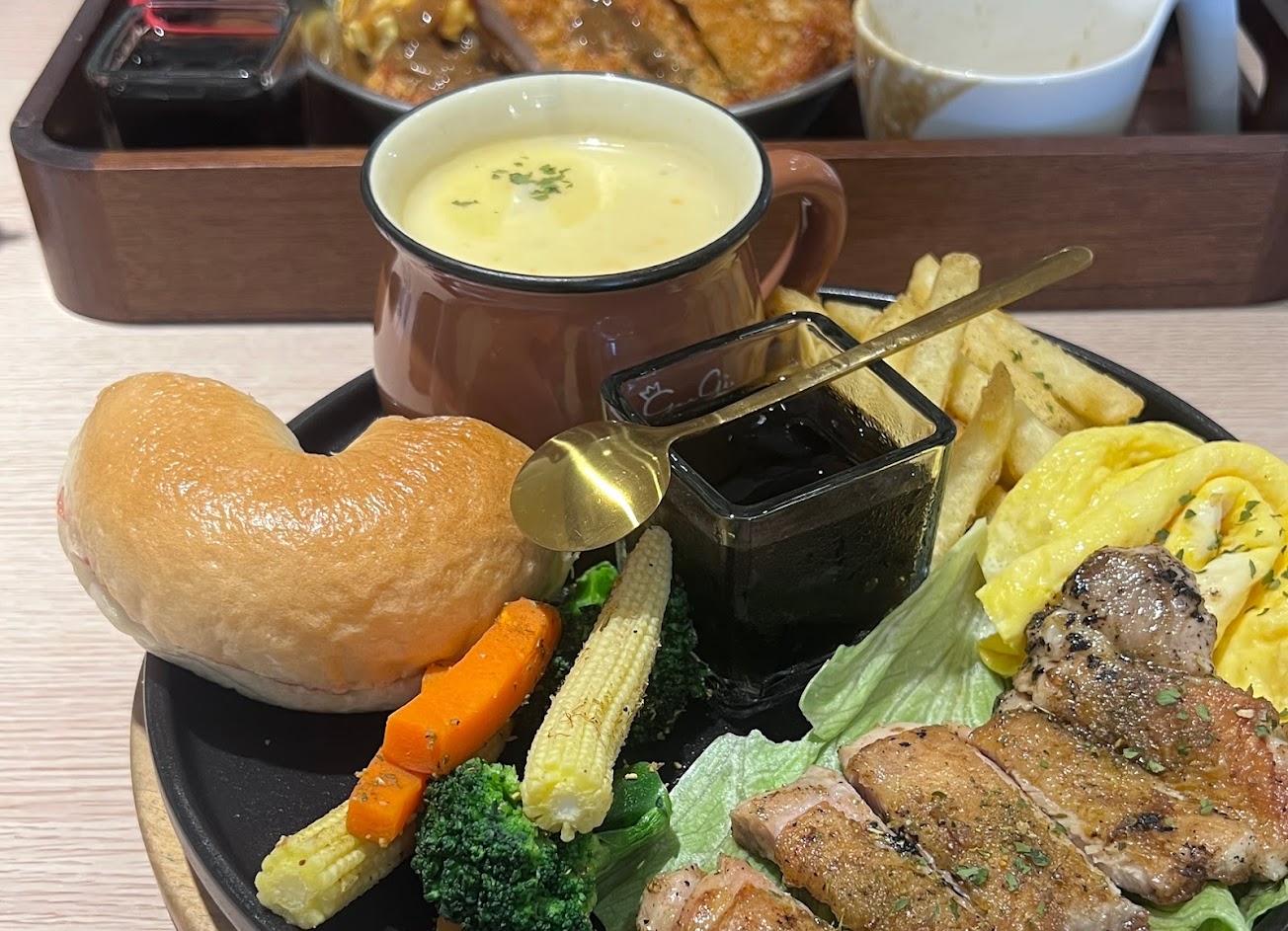 ▫️普羅旺斯嫩雞拼盤 $195 嫩雞煎的剛剛好 好吃 拼盤有附薯條?、濃湯、蛋、疑似仙草凍的甜點 ?麵包可以五選一 選了1/2的草莓貝果? 咬了一口大驚‼️完全咬不下去 以為是自己戴牙套的關係 請朋友咬一口他也咬不下去 不曉得怎麼了 是輪胎貝果嗎
