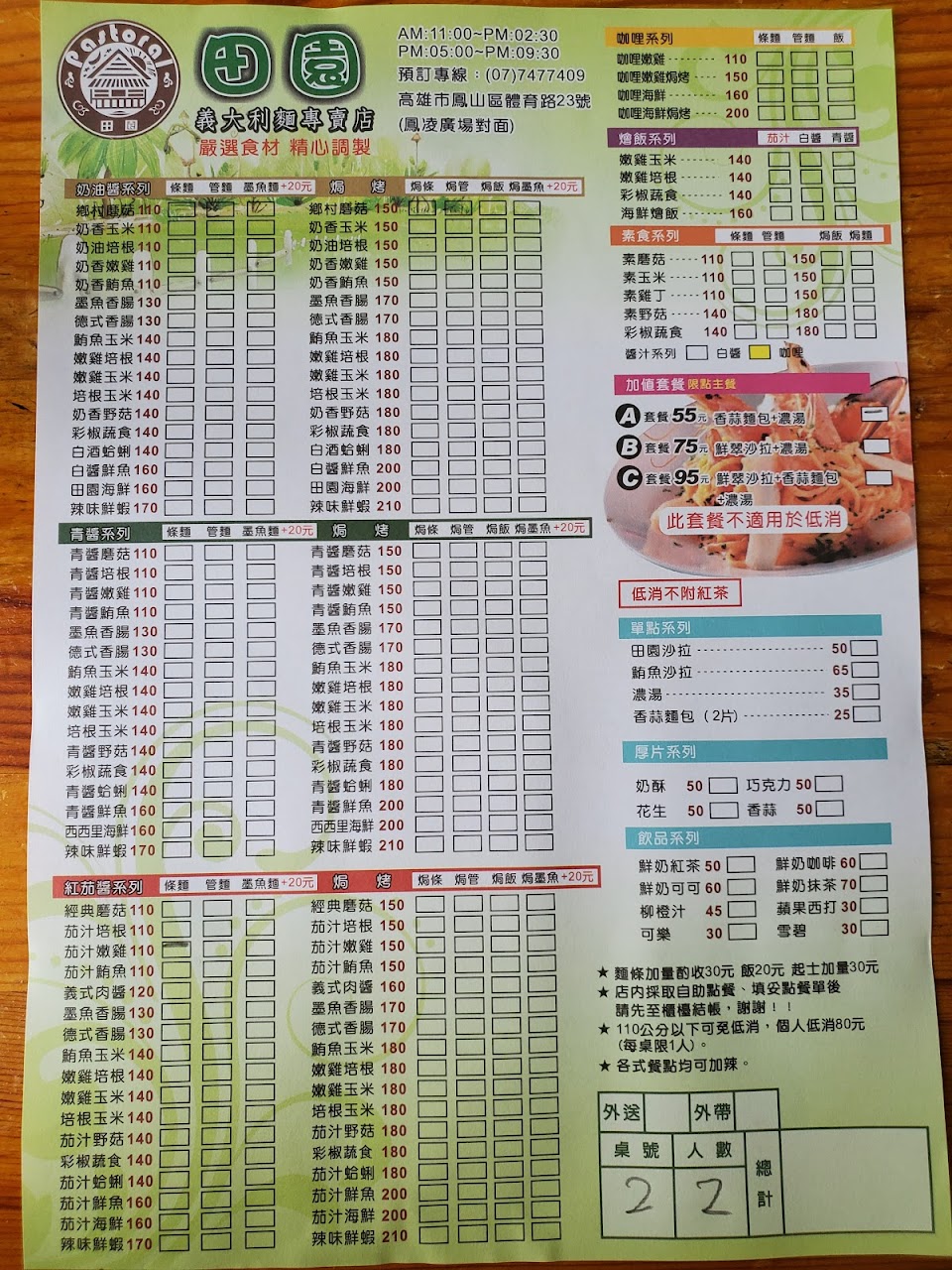 田園義大利麵開在鳳山體育場旁,開很久了,座位不多,老闆兼櫃台與送餐,廚房好像就一位在準備料理,所以生意好時後,可能須要等後一下,菜單裡面有奶油,青醬,紅茄醬三種,價位110元-200元左右,選擇性頗多的,鮪魚、培根、嫩雞等,低消是80元,A套餐加55元,有蒜香麵包與濃湯,B餐是65元沙拉與濃湯,C餐85元就是三樣都有!蒜香麵包,還滿厚食的,味道香濃!很特別的是燉飯的湯汁與飯是分開給的,讓您去自己攪和,非常台式的吃法,這樣也好,看得清楚裡面放了多少塊肉,一覽無遺,青醬是自己做的,口感吃得出來!玉米放很多,還有小塊肉與花椰菜,不會太鹹,很像是義式的粥料理,很特別,醬汁好吃是真的!麵算是Q彈的,且有入味,不會覺得是分開吃的感覺,吃麵同時也可以把醬汁給吃進去,滿多人都點義大利麵的,不過這邊的口感真的是偏台式喔!!畢竟這樣的價位,有這樣的美味就心滿意足了!!飲料部分是紅茶放在一樓,自由取用的,不過味道可再加強啦。