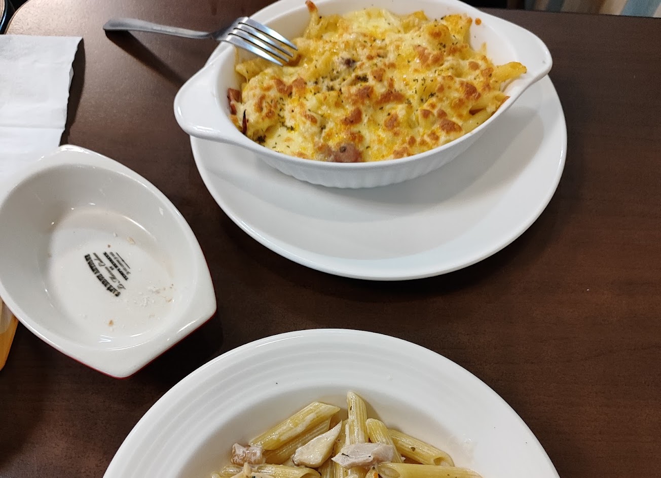 炸豬排義大利麵,印尼煎雞排燉飯加焗烤,義式香腸披薩。推薦義大利麵跟披薩