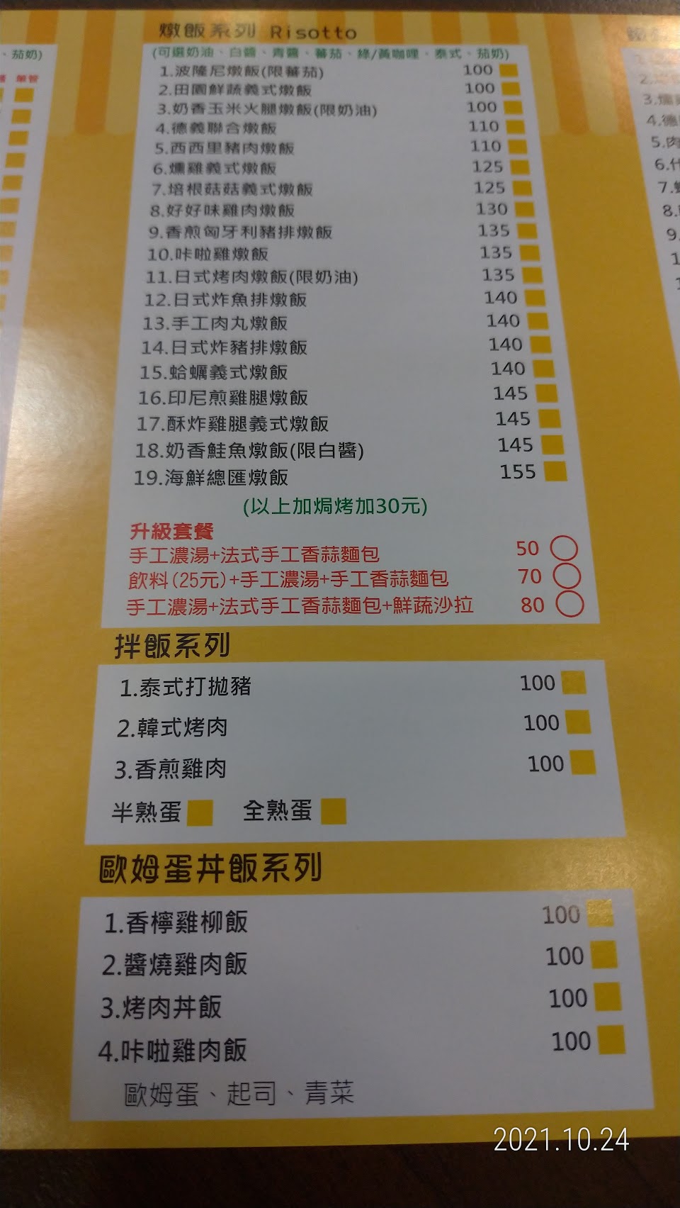 有很多種餐點可選擇,燉飯、歐姆蛋丼飯、披薩都好吃,可以電話預訂餐點,也有和外送平台合作