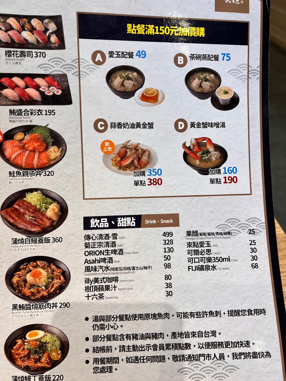 生魚片冰冰的,也很新鮮。加購的味噌湯可以續。比藏壽司那些連鎖店稍微貴一點點?