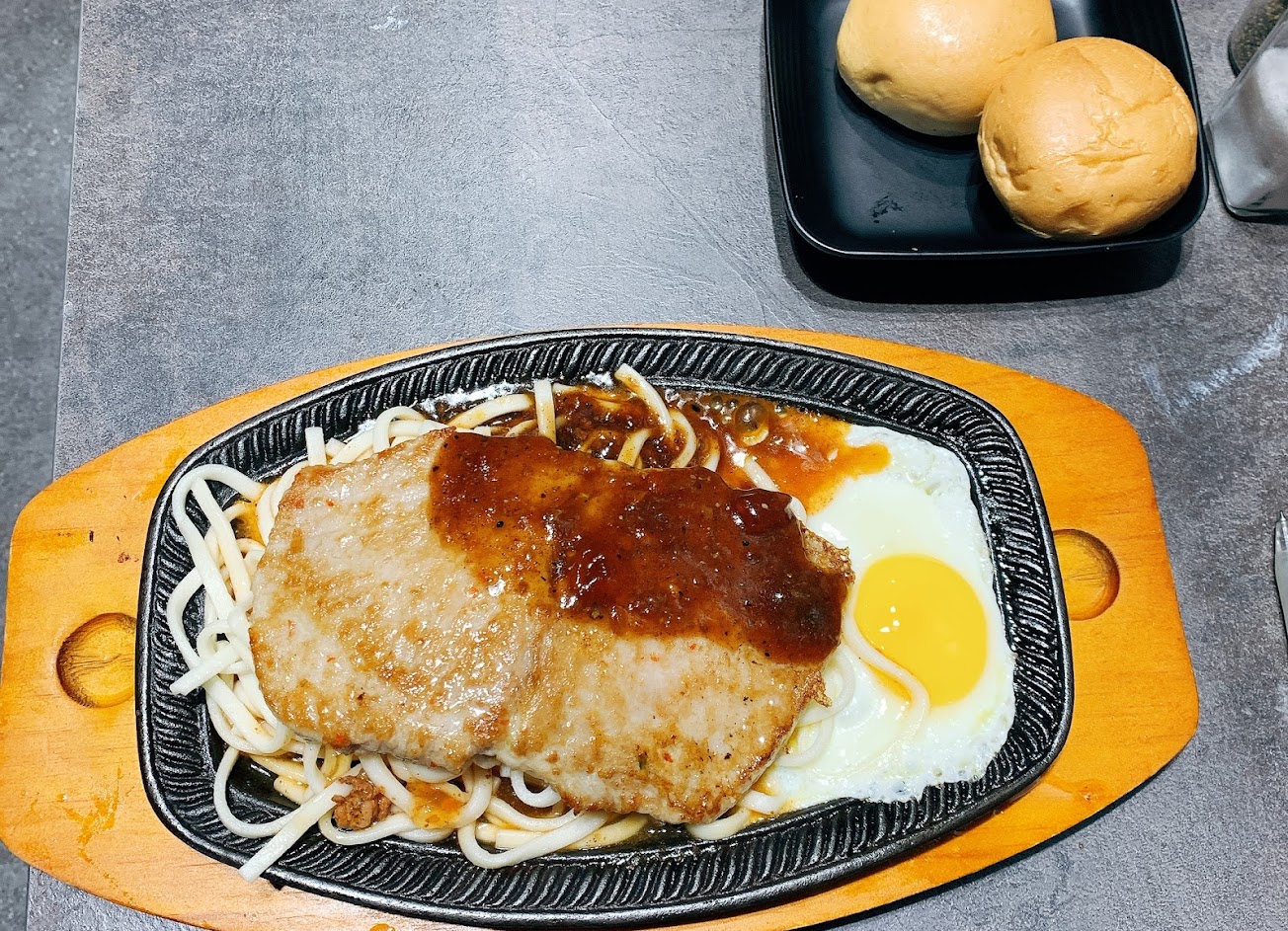今天第一次去,爸爸點美國沙朗牛蘑菇醬,他覺得蘑菇醬太多太水;媽媽點厚豬排,她讚不絕口,醬汁比例剛好,肉超厚又嫩;我點雞腿排加麵,鐵板滿滿的麵,雞腿排另外裝盤,雞肉很嫩,我覺得CP值很高,吃不完,還打包回家。overall it’s great!