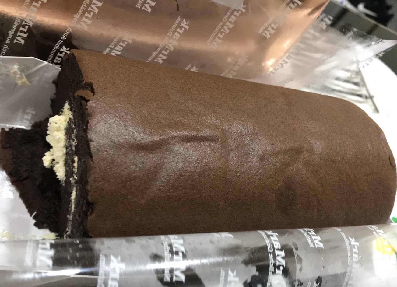 巧克力燕麥豆漿蛋糕捲-很好吃,蛋糕巧克力味道很濃郁,而且蛋糕體也很濕潤,奶油屬於清爽不甜膩,非常推薦購買,比亞尼克便宜又好吃。