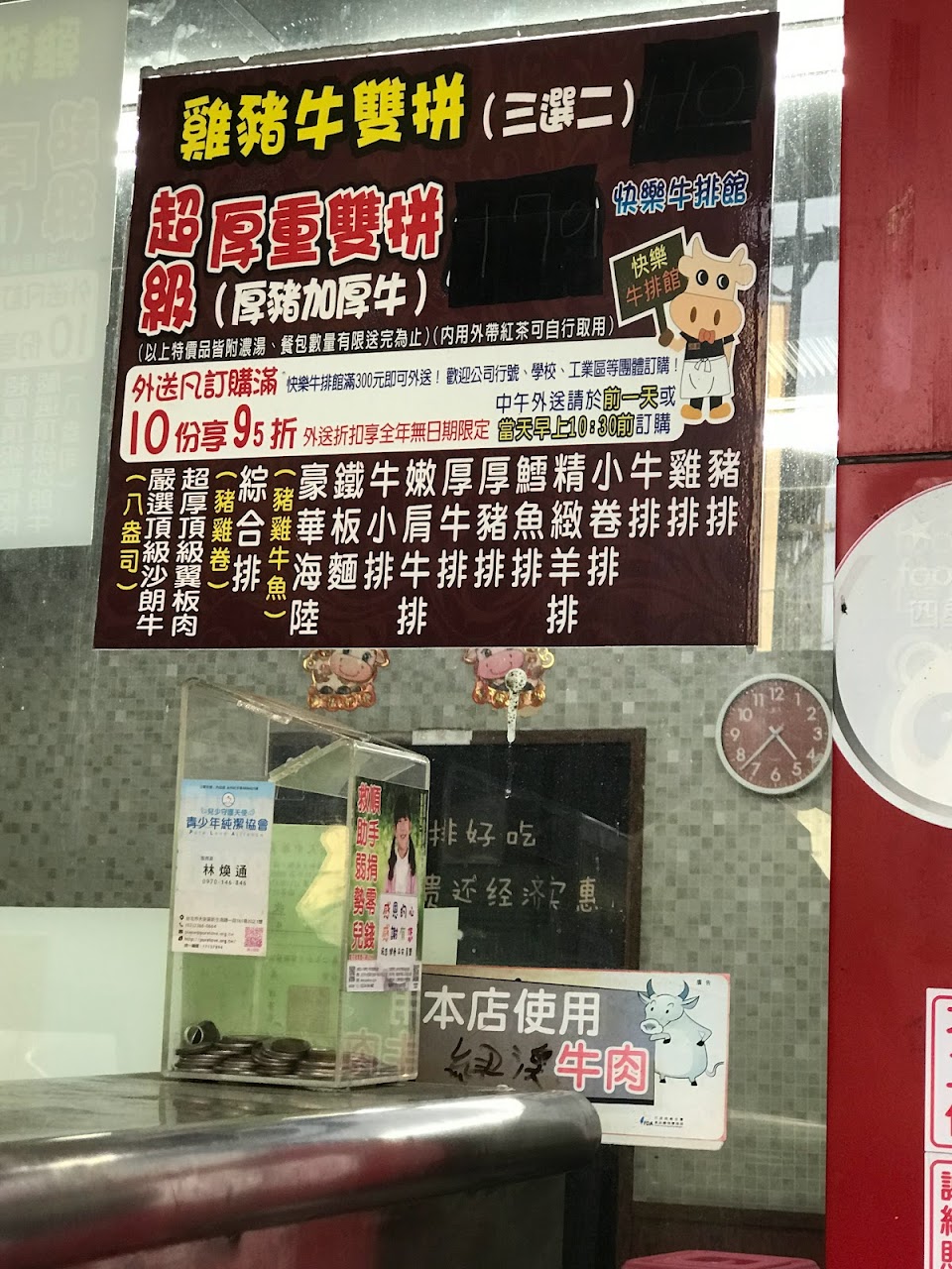 每次到中庄吃飯第一個想到的就是快樂牛排,店家位於大寮八德路,旁邊就是21世紀,有很大的地標可搜尋停車又很方便,在餐點方面店家有精心為客人挑選本店招牌排餐,尤其是超大塊沙朗牛排更是經典,要告知店家煎至六分熟就好,厚厚的牛排外酥裡嫩,一刀切下去滿滿的湯汁,吃起來很鮮嫩不會柴柴乾乾的,本店的玉米濃湯也很棒,湯勺舀下去就飄出香濃奶油味,湯內食材也很多,不像有些店家就隨便煮煮唬弄客人,更慘的是還沒半顆玉米可撈,還會附贈1顆奶油麵包,外加紅茶喝到飽