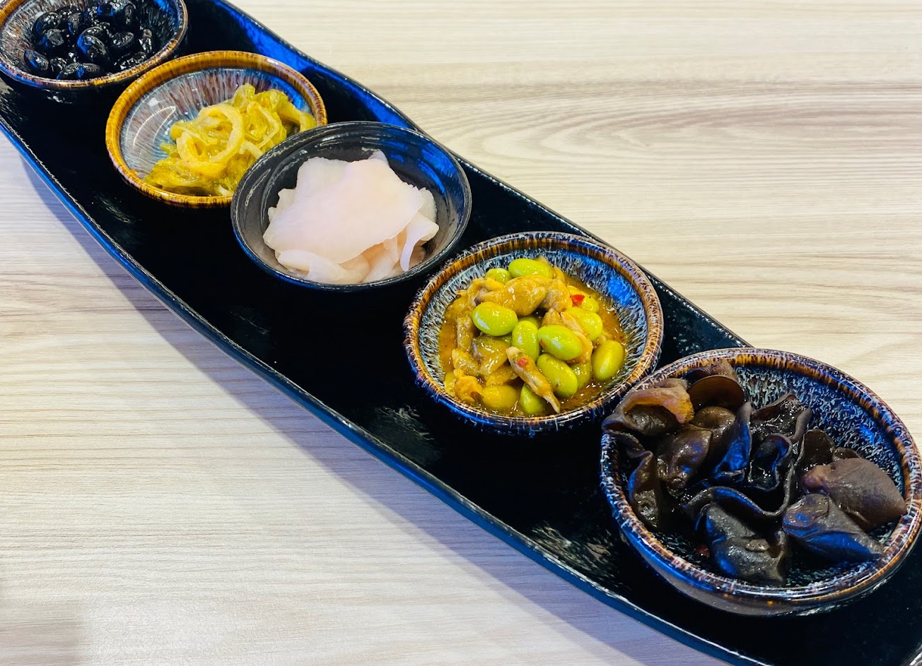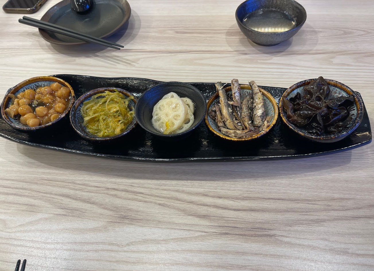 小菜五品當天吃到的有黑豆、炒牛蒡、醃蘿蔔、漬蜆以及木耳,小菜裡面竟然可以看到蜆類可以感受到店家的大方和用心,不是隨便弄五個小菜,調味也都蠻不錯的,雞湯濃淡適中,建議可以不用再另外點湯類