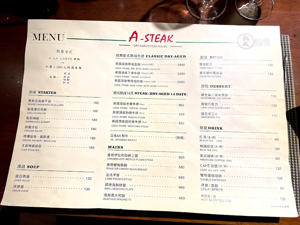 從前菜、濃湯、主菜、到飲料,完完整整地吃到這餐廳的用心,或許甜點較平淡了點,但以兩人2400元的消費,享受到如此的美味與服務,個人認為非常值得,牛排餐廳就以牛肉為主力,乾式熟成與濕式熟成的差距在本店可以感受的一清二楚,乾式熟成的牛肉多了很豐富、多層次的風味,雖然本人未上北部享用過那些米其林名店,但A-Steak牛排餐酒館我相信在南台灣肯定是翹楚之一,非常值得喜歡吃牛排的人到訪。