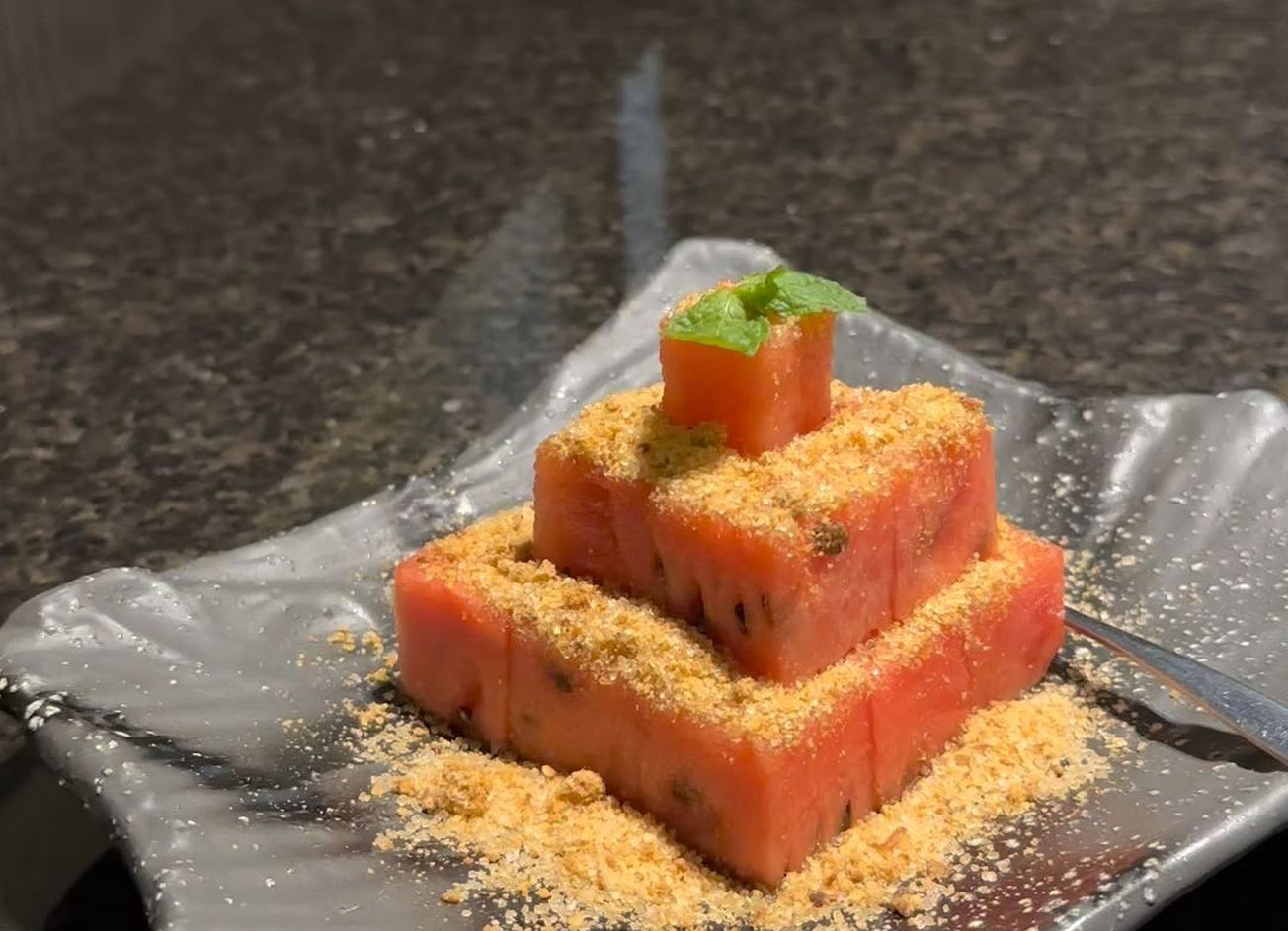 甜點的西瓜上面有淋滿花生粉,有點創意料理的感覺,擺盤好看,但味道見仁見智。