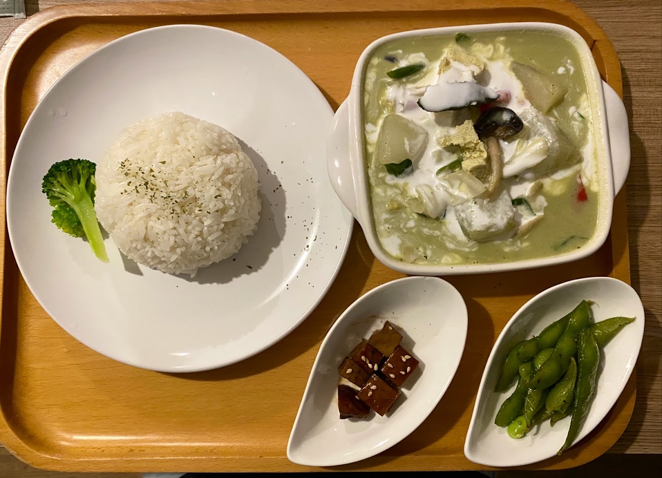 主打泰式、義式料理的蔬食館,用餐環境不錯,來過幾次。個人偏好泰式餐點,過去都是吃麵類,第一次點飯類,泰式咖哩醬的辣度及香味頗為喜歡,辣辣的口味搭配一杯甜甜泰奶,中和一下。惟價位高、份量偏少,停車較為不便。