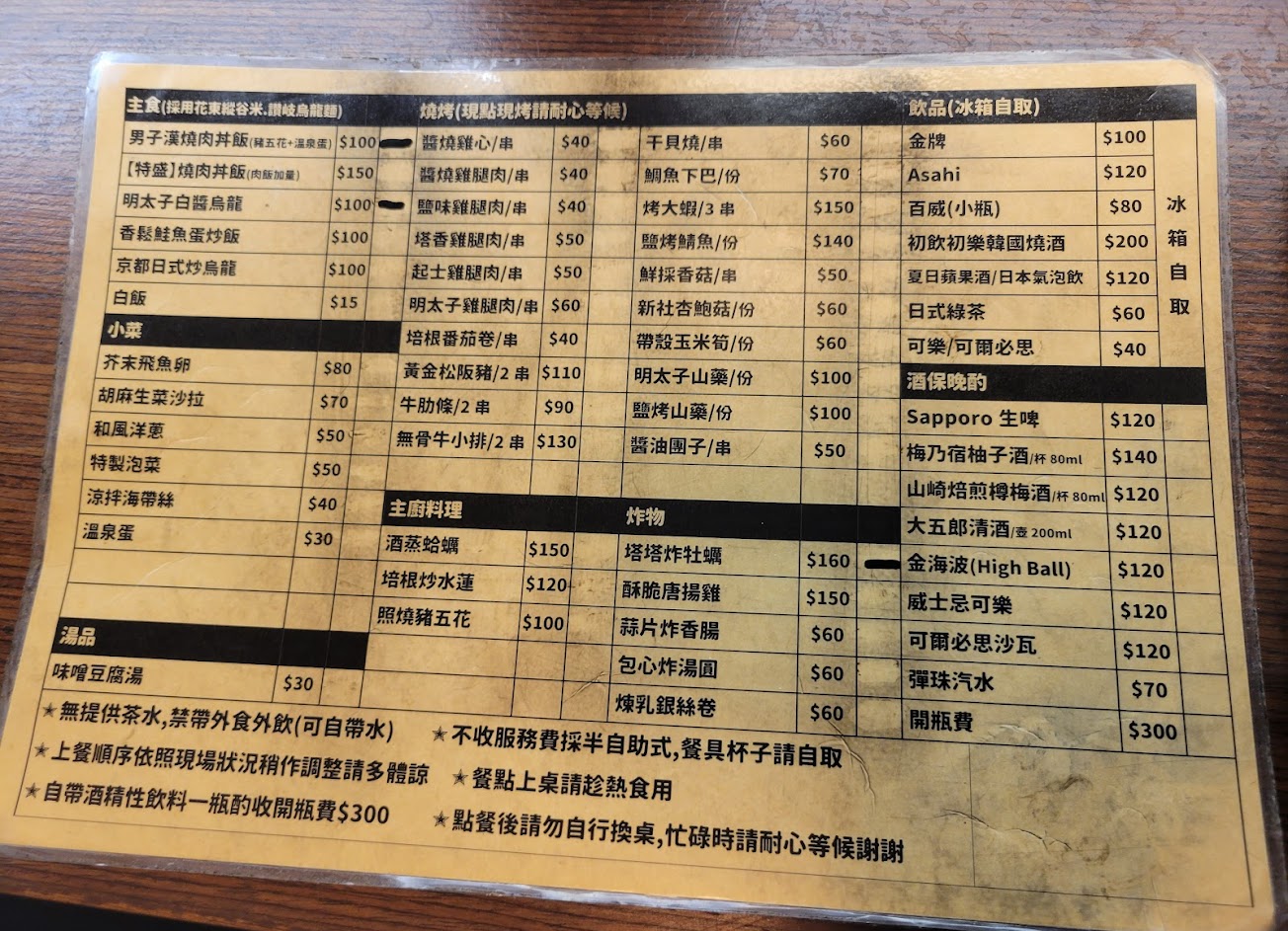 價位便宜,明太子烏龍麵很好吃!每次來必點,但串燒個人覺得還好