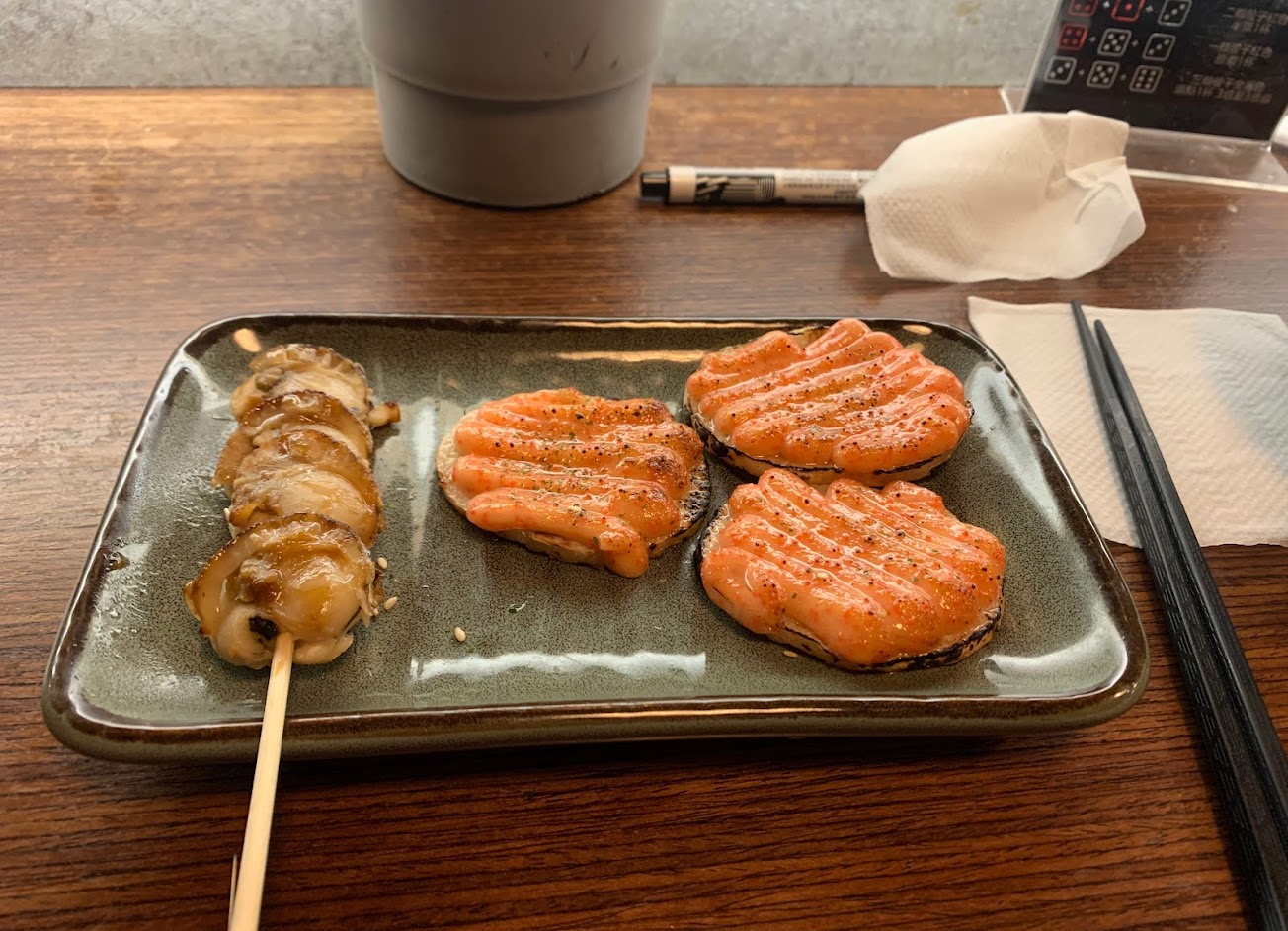 點了明太子烏龍麵、明太子山藥、烤雞串還有鹽烤鯖魚等,炙烤的味道都很不錯,推推??
