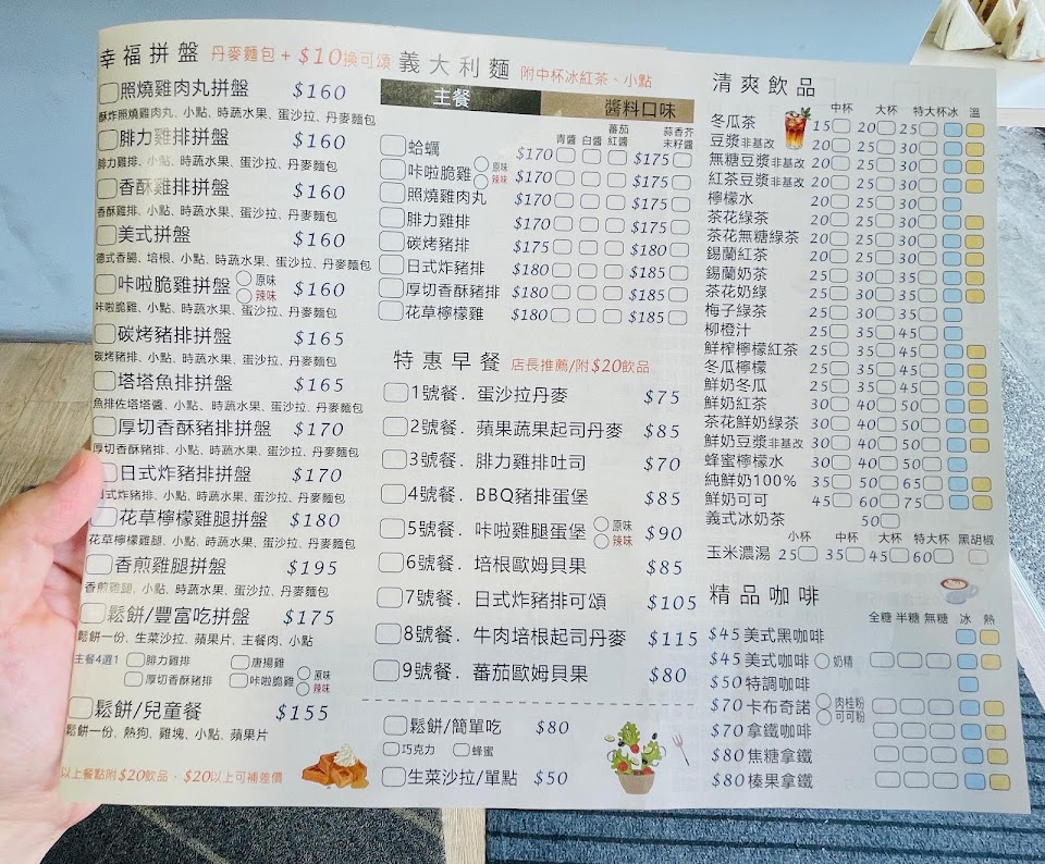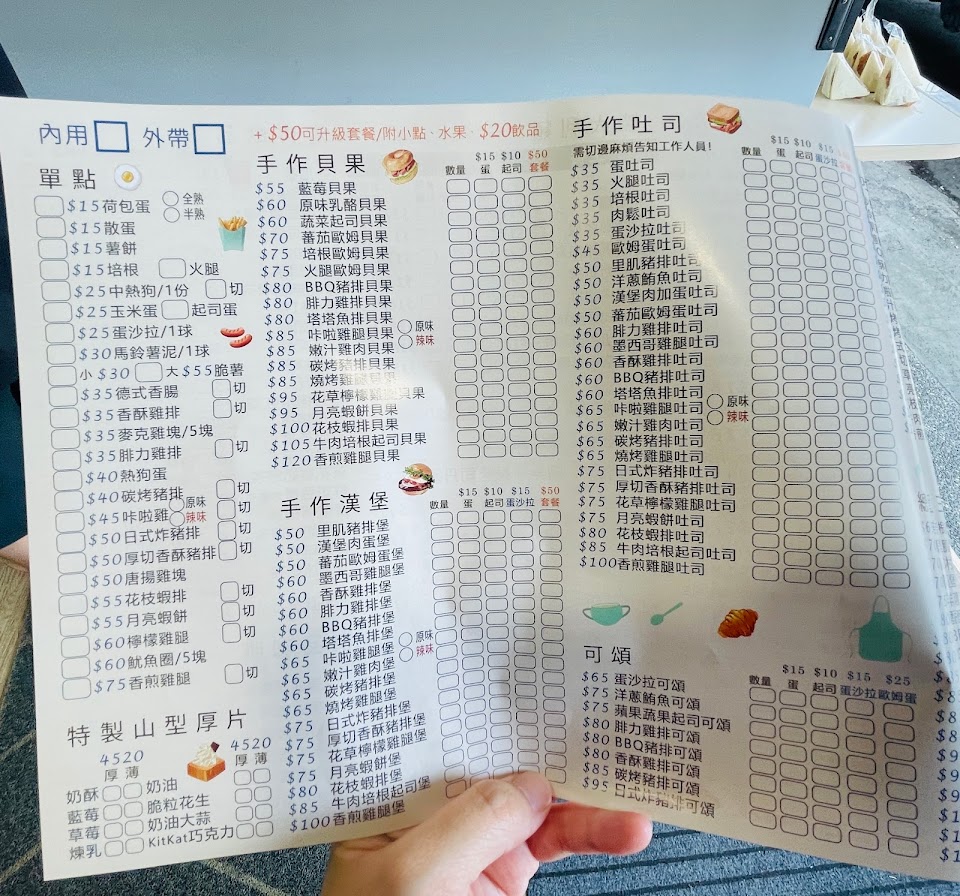 以早午餐來說價位偏高,口味與一般台式早餐店差不多,但餐點選項多樣,且有室外座位,整體算舒適,適合久坐聊天。
