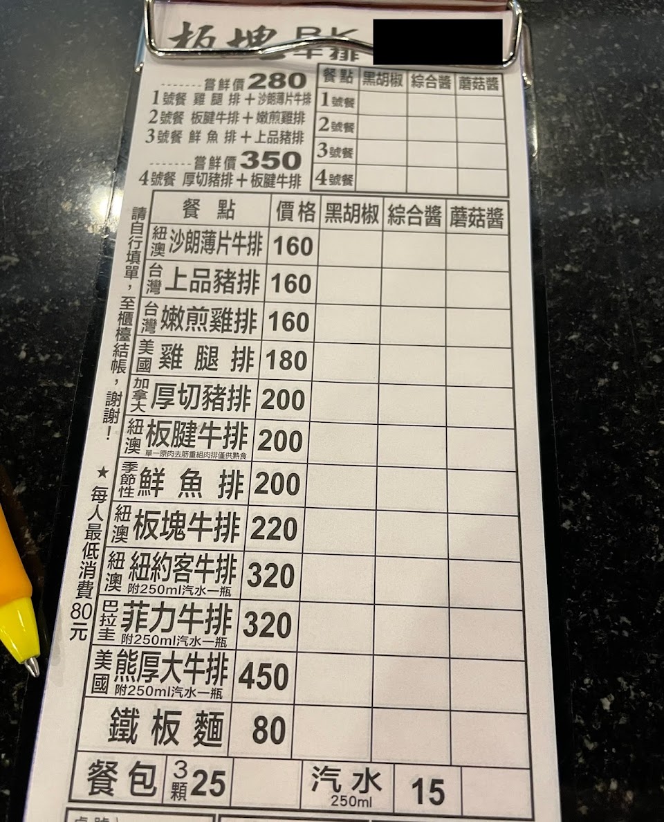 跟其他平價牛排店比較起來CP值不高,主餐配菜極少只有冷凍花椰菜一朵和一點點洋蔥,鐵板麵很Q不錯吃。