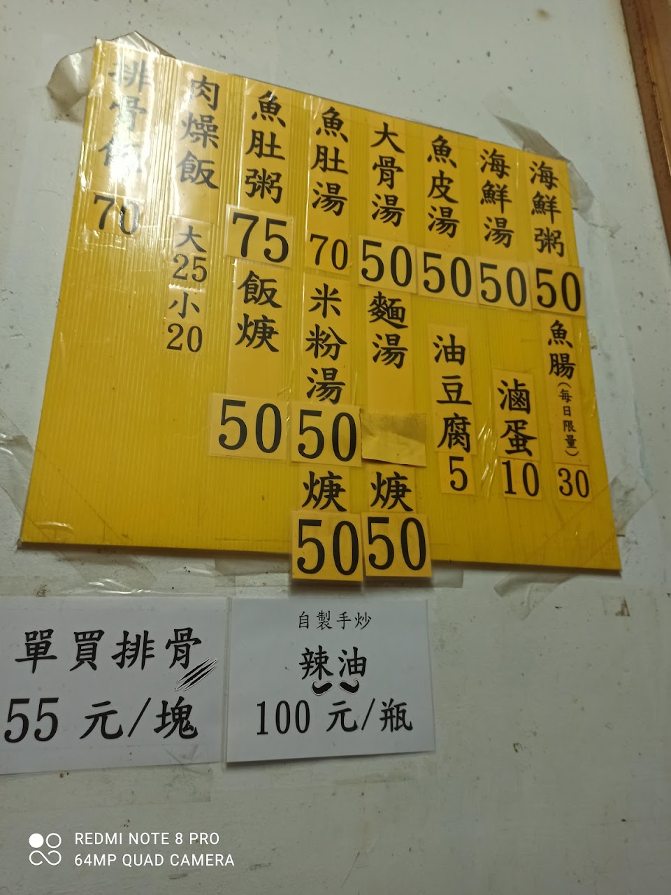 排骨滷得入味、軟嫩,醬汁鹹甜適中,搭配酸菜非常對味。海鮮粥的配料很有誠意,湯頭也很棒;麵羹的調味不似台南的甜,蛋絲更為這碗羹湯增添特別風味;當天老闆娘推薦了煎魚腸,焦香酥脆,撒上胡椒粉搭配薑絲,很棒耶!