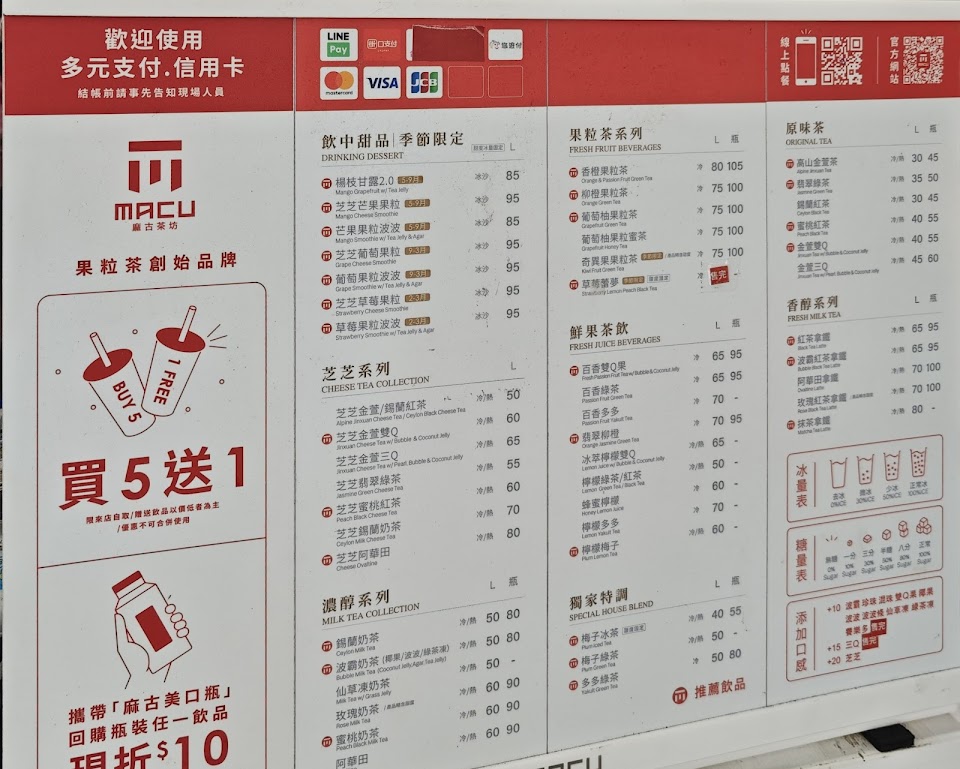 *來店買五送一 *自備環保杯折2元 *持麻古美口瓶回購,瓶裝系列折10元