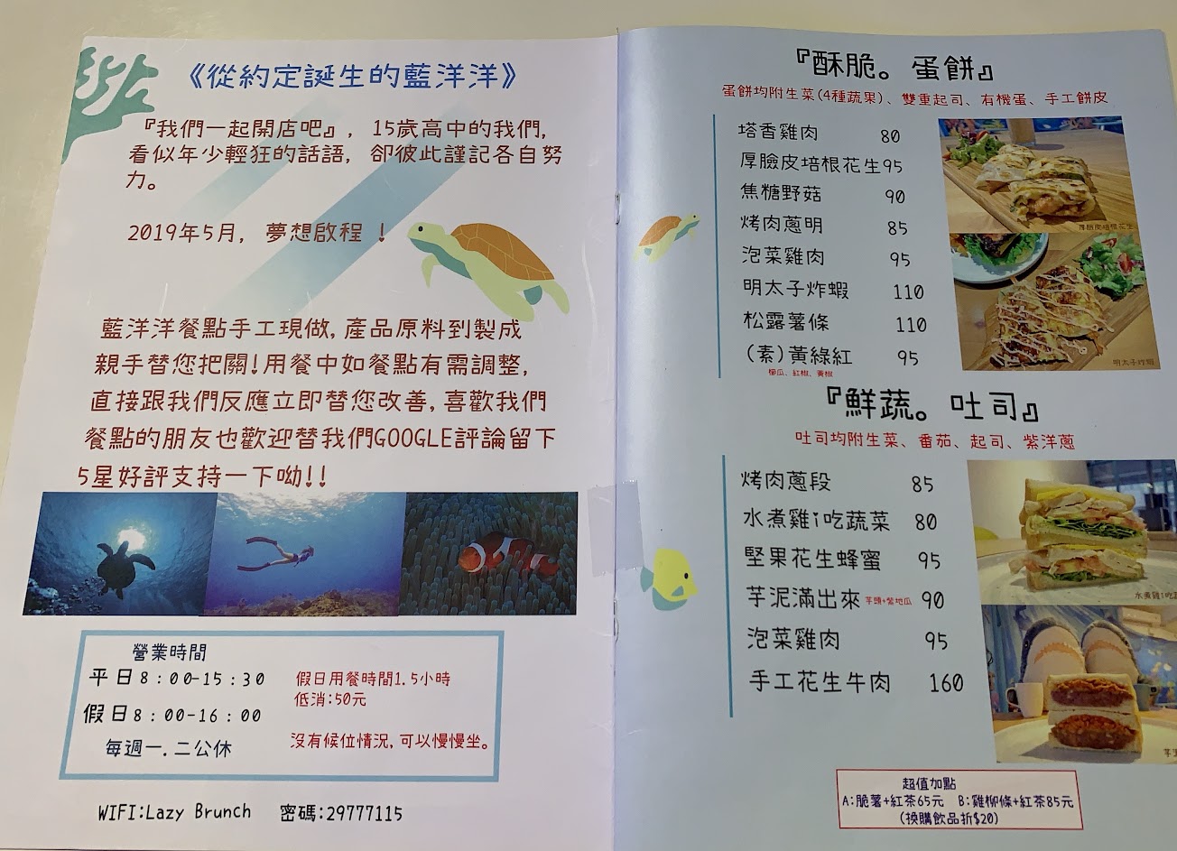 謝謝老闆親切的服務以及友善孩童的態度,蛋餅跟義大利麵都有在水準裡~~~ 令人感覺到溫暖的店不多了,餐點樣式也豐富,海洋生物主題不只療癒大人也震住孩子~~~不僅僅用餐還彷彿走進了海生館,愛護海洋也是生命教育重要的一環喔~~~(常常跟孩子說北極熊都要沒水喝了!!!)