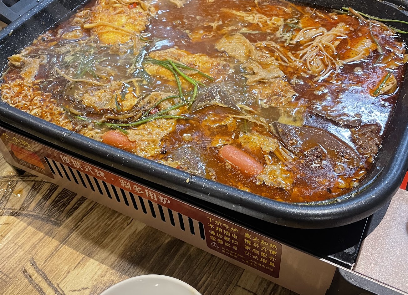 餐點招牌水煮魚中辣,辣度很舒適,內容物有凍豆腐、鴨血、金針菇、香菇,單點老油條很酥脆,不油膩,添加進水煮魚與牛肉毛肚內,很好吃