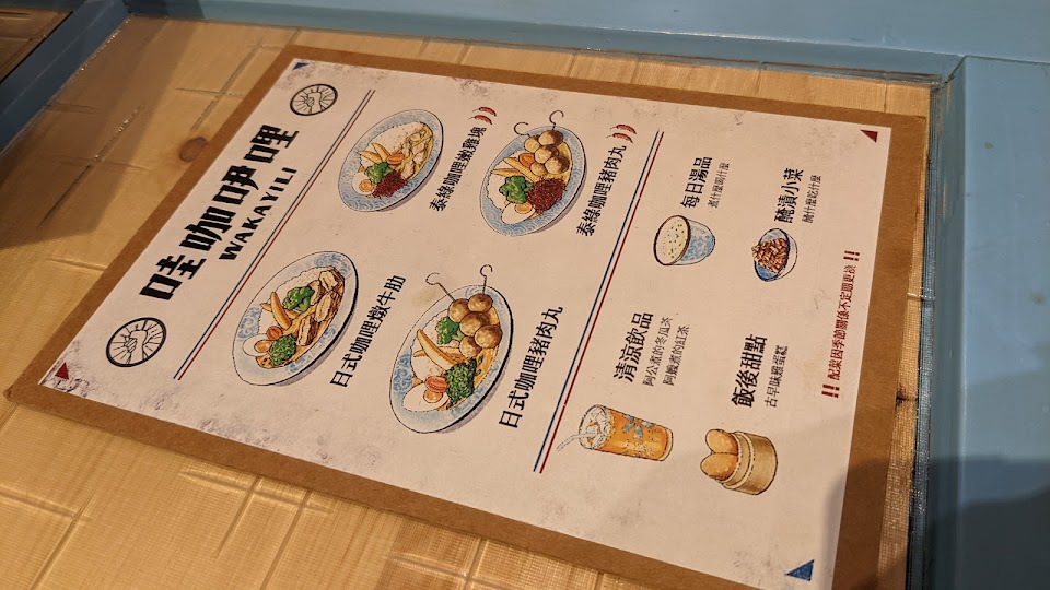 哇咖吚哩=我喜歡妳、我和妳 年輕老闆&老闆娘不只名字取得用心,並且將老屋保有外更延伸出自己的風格。 沒錯,一進門整個視覺感會讓人想起小時候回到鄉下外婆家的感覺,那一景一物這麼的似曾相識。 鐵花窗的外門窗戶,連用餐的桌面也是古早窗戶拆下做成,當然不只於此,連牆面擺放玩具也是小時候的童年。 這裡販售的是咖哩飯,簡簡單單共4種口味,分成2種辣2種不辣。綠咖哩醬調的不錯小辣辣度符合我的口味,雞肉選的是雞腿肉煎過後的嫩度搭配綠咖哩非常適合。牛勒條是有嚼勁的那種與特製咖哩醬結合後非常下飯。飲料喝起來有古早味,微微的甜度最剛好。 最後用完餐上來的雞蛋糕實在很特別,店家這點子很不錯,烙印上雙手互相打氣,給人最後結尾訴說著加油!元氣滿滿的努力面對每一天!??