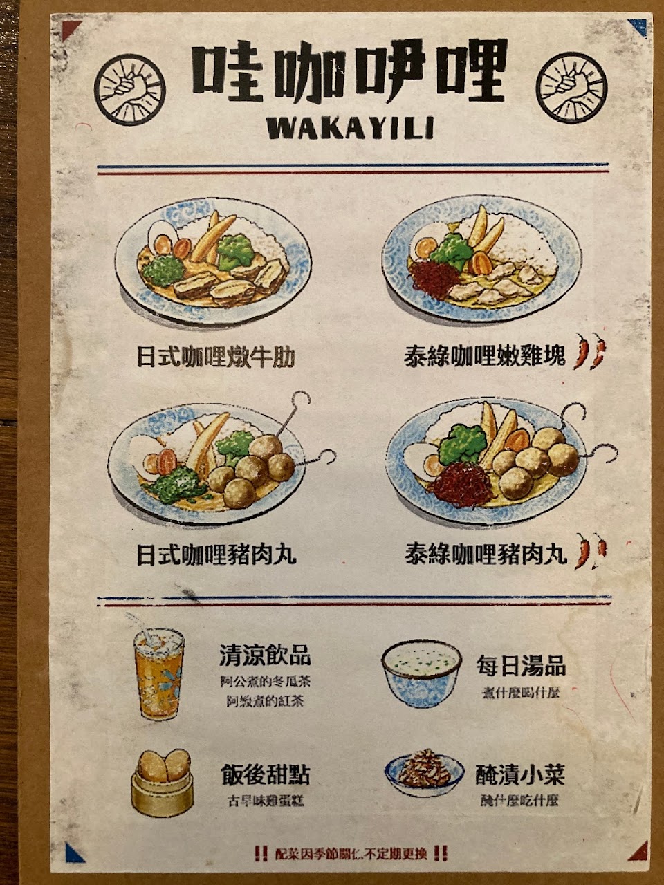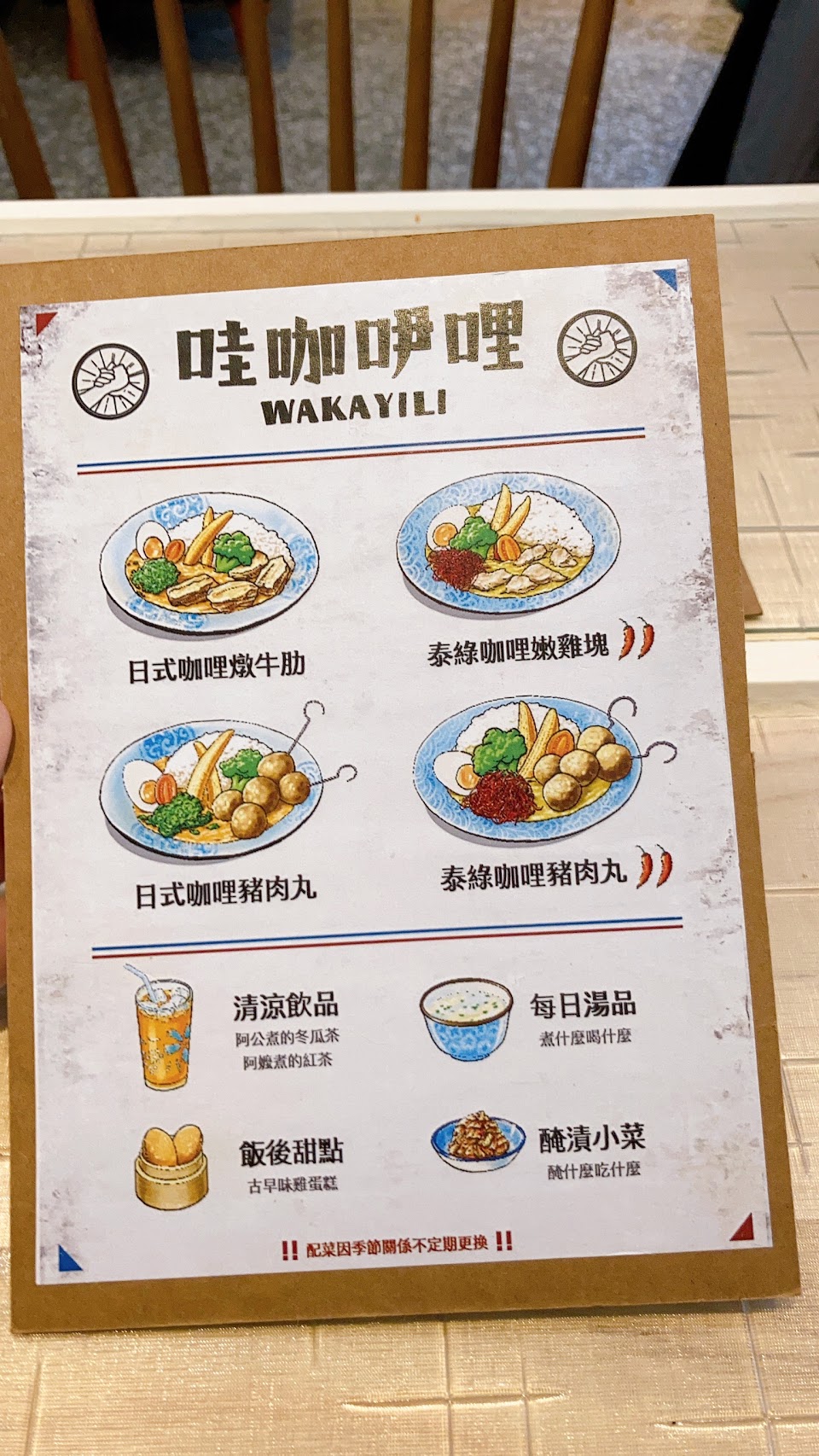 菜單很可愛,是圖畫式的,只有四種菜色,二種口味日式咖哩與泰綠咖哩,再搭配三種食材 ,日式咖哩是不辣的,泰綠咖哩是辣的!每份都是套餐方式,一份260元~ 有咖喱飯、每日湯品、小菜、飲料、雞蛋糕