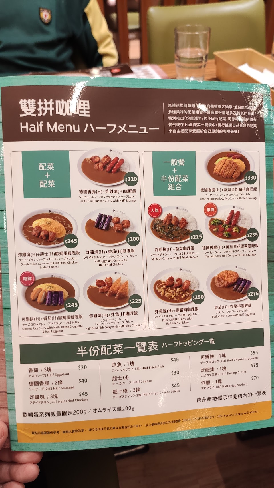 咖哩只剩下鹹,沒咖哩香氣;叫了份脆辣雞腿,比我唸小學的小孩手掌還小⋯要價2百多,想吃飽還要加到500g的飯量,加價60⋯C/P值極差