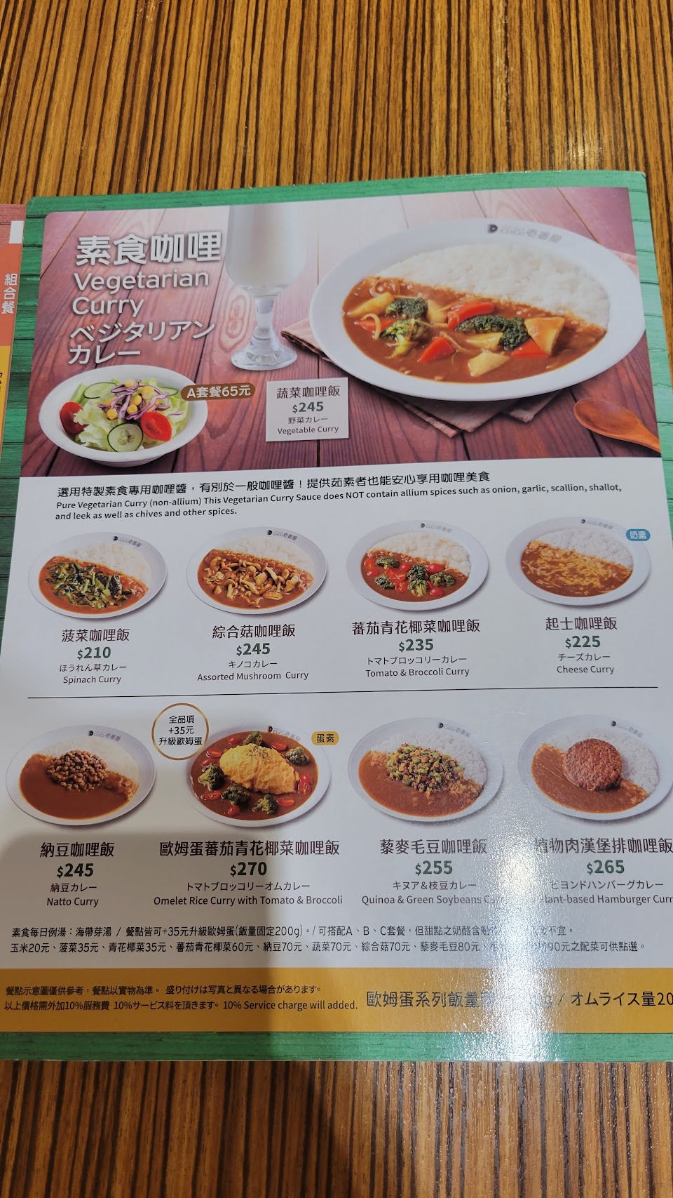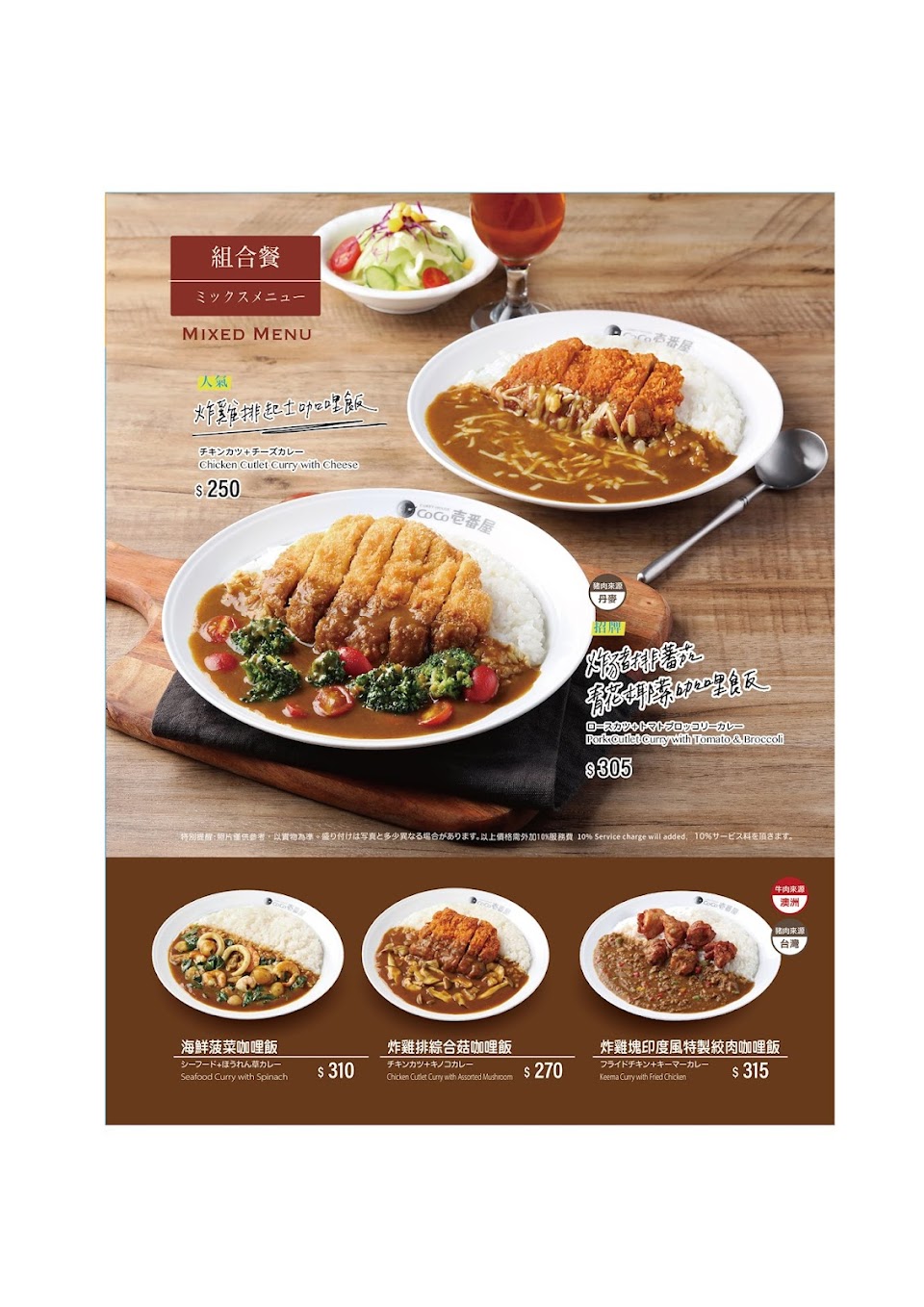 歐姆蛋炸雞塊番茄青花椰菜咖哩飯, 洋蔥湯, 酥炸牡蠣咖哩飯, 炸雞塊菠菜咖哩飯, 涮豬肉咖哩飯, 歐姆蛋炸雞排綜合菇咖哩飯